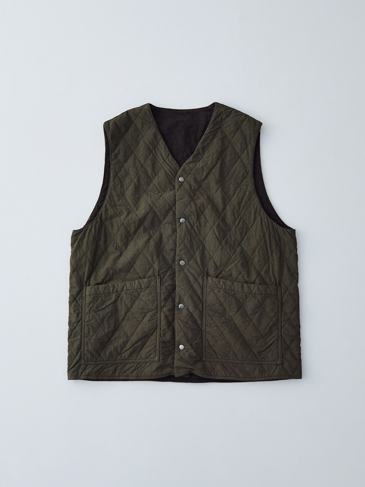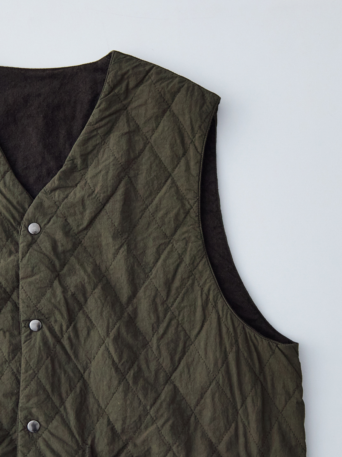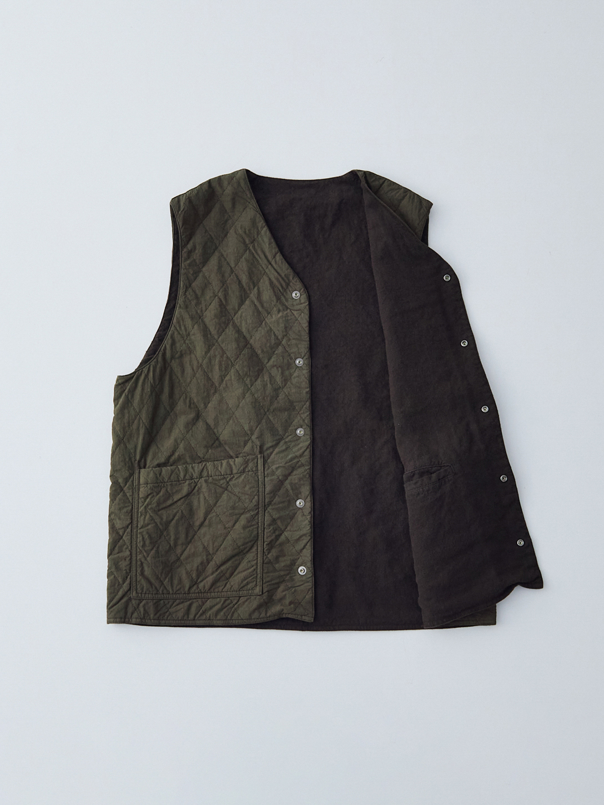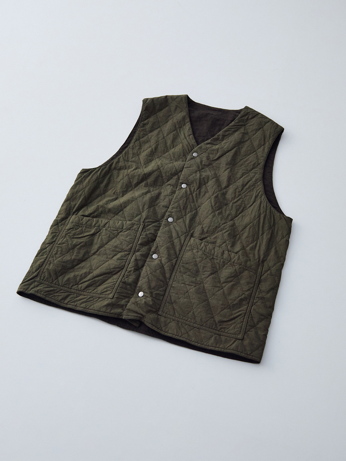 앞면은 퀼팅, 안쪽은 기모 가공한 리넨으로 구성된 리버서블 퀼팅 베스트입니다.
