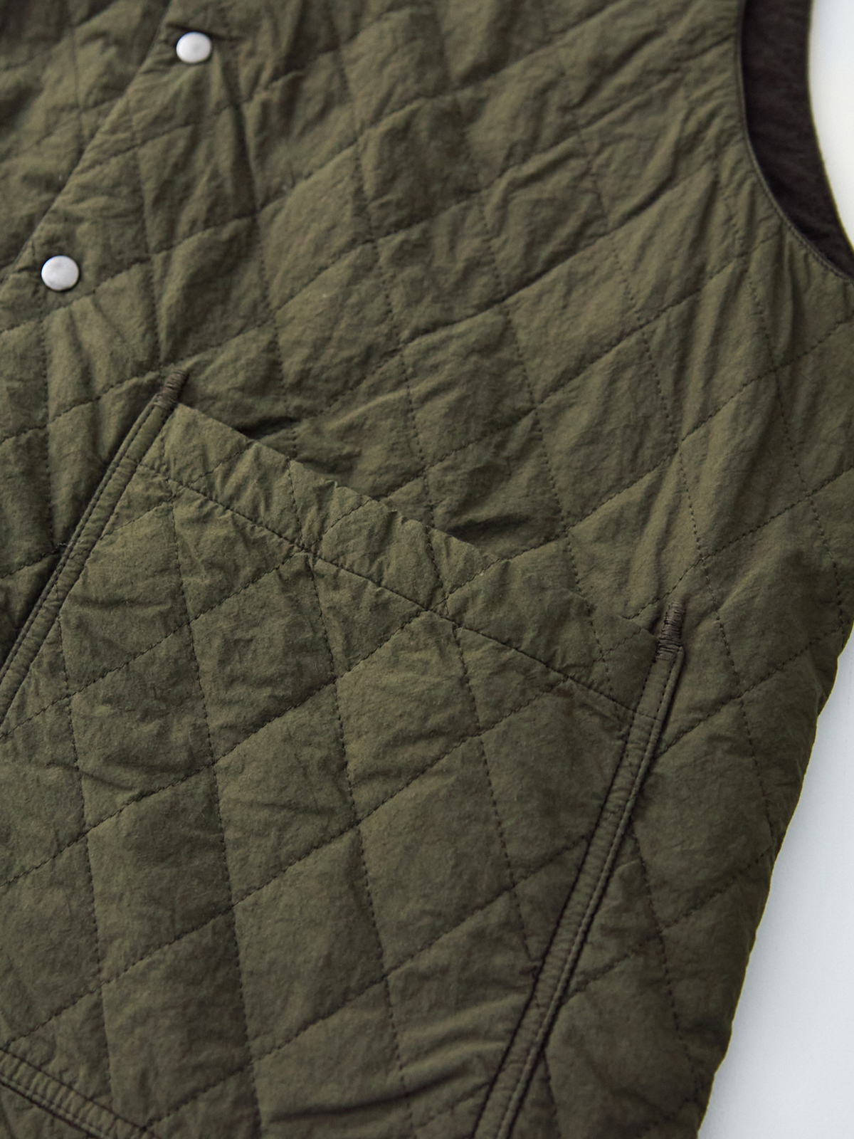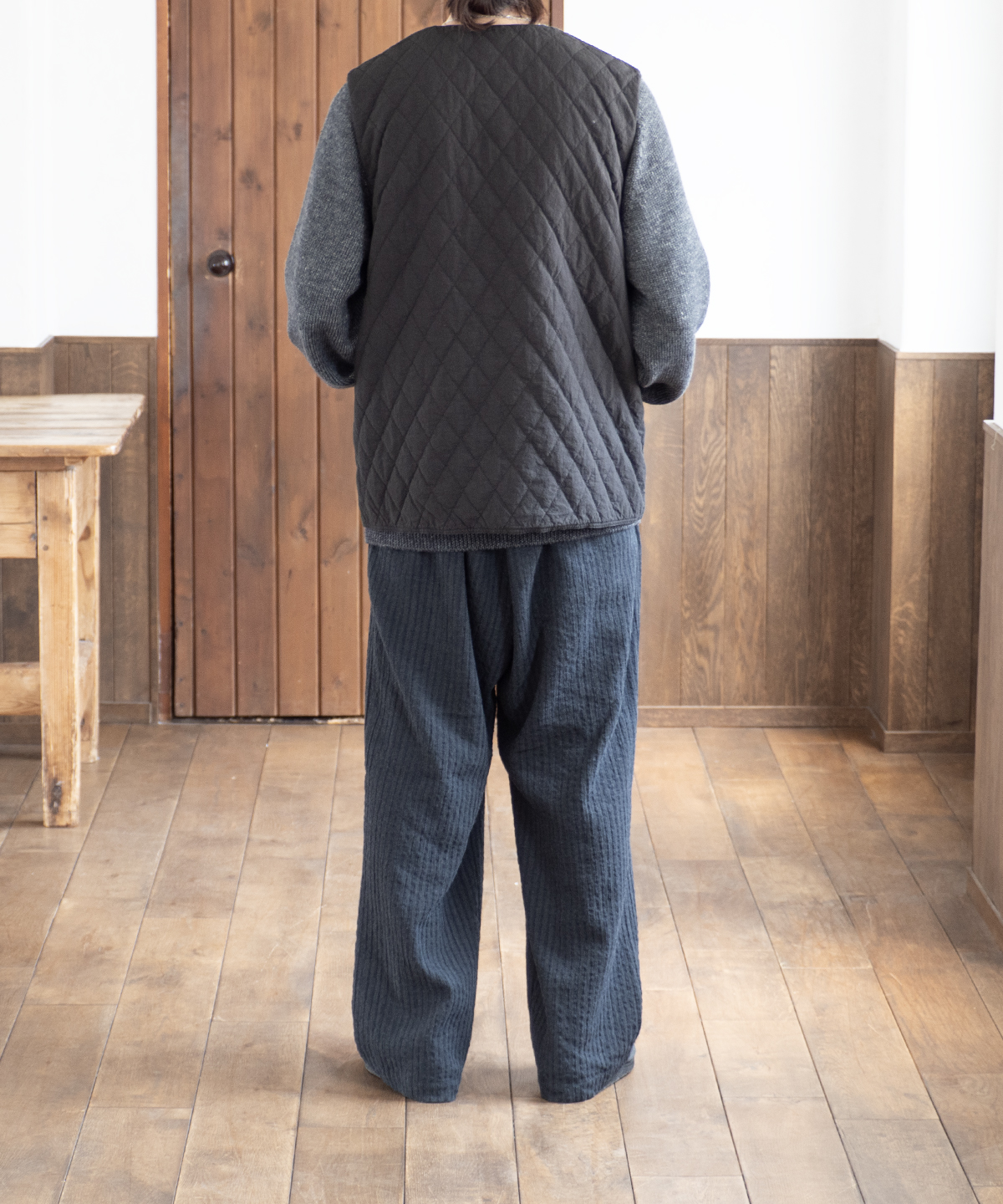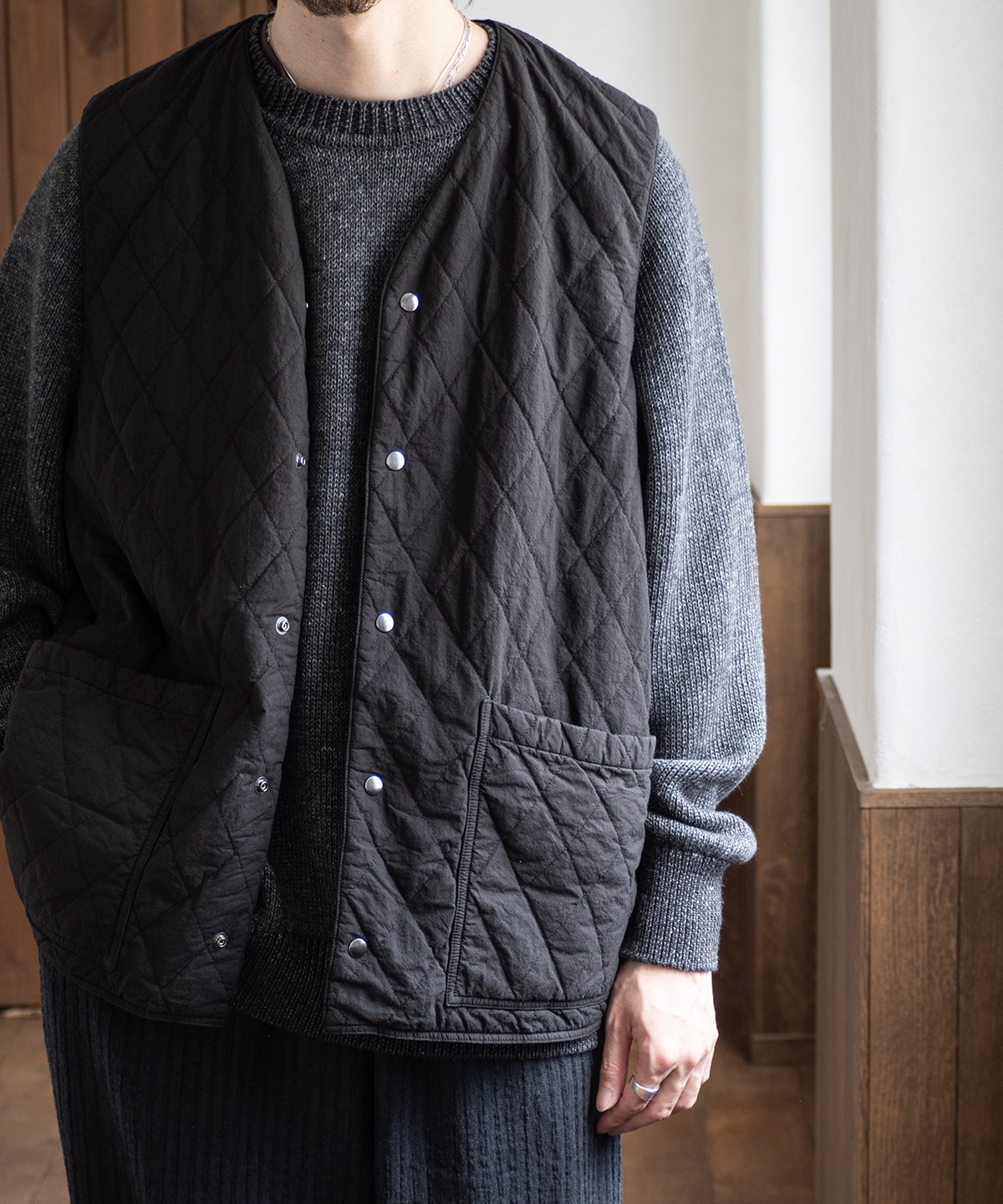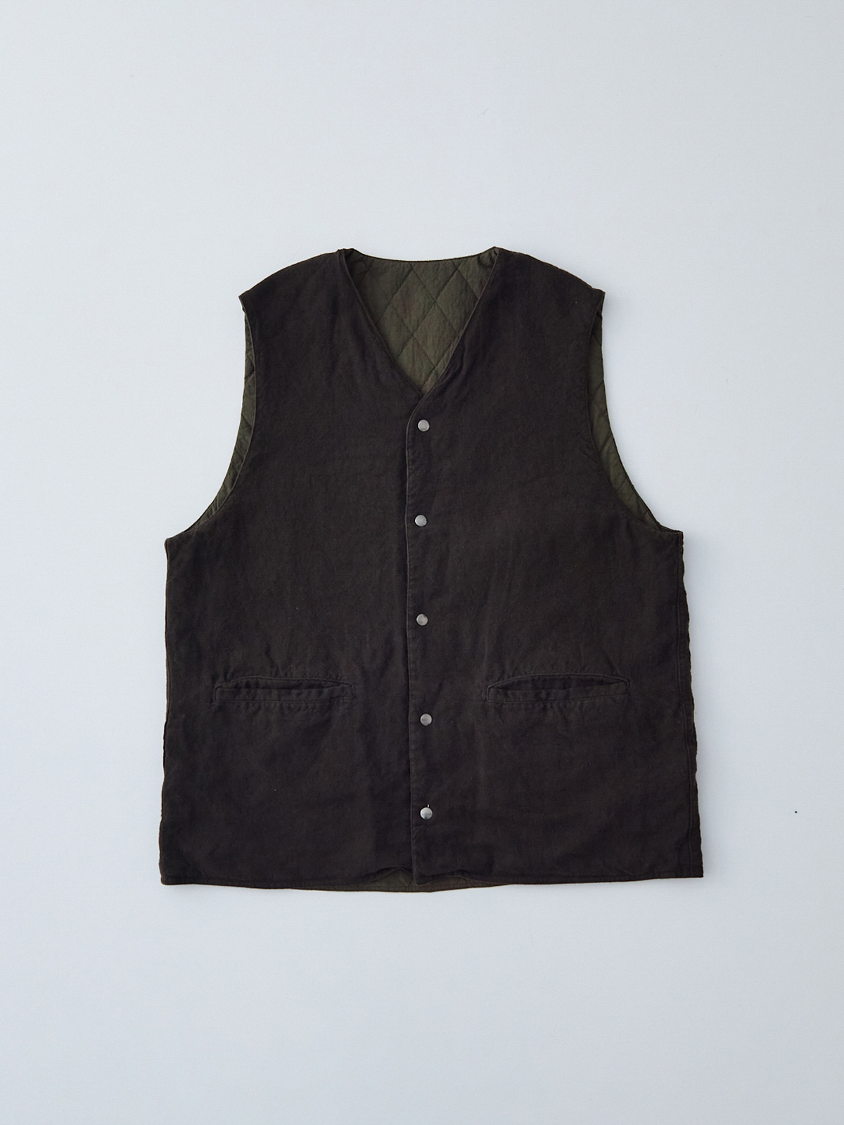 앞면은 퀼팅, 안쪽은 기모 가공한 리넨으로 구성된 리버서블 퀼팅 베스트입니다.