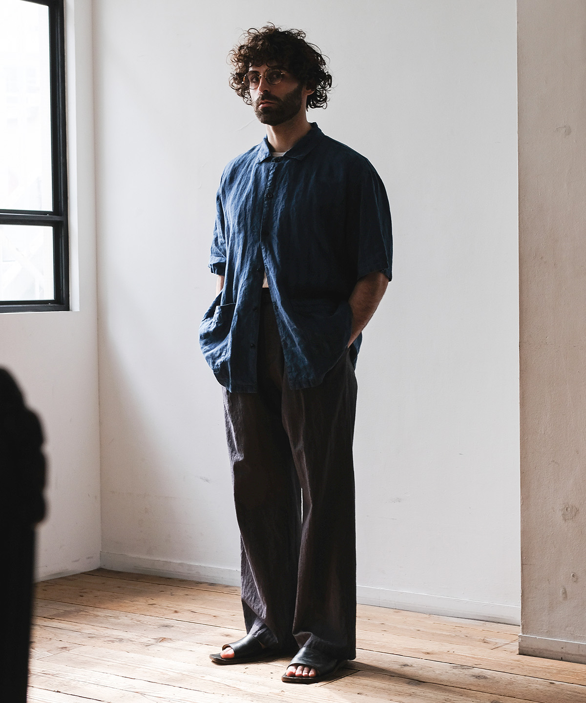 린넨 특유의 원사 굵기의 불균일함에서 오는 군데군데의 슬러브(Slub)와 오존 워싱으로 전체적으로 페이딩(Fading) 된 컬러감이 빈티지한 매력을 더합니다.