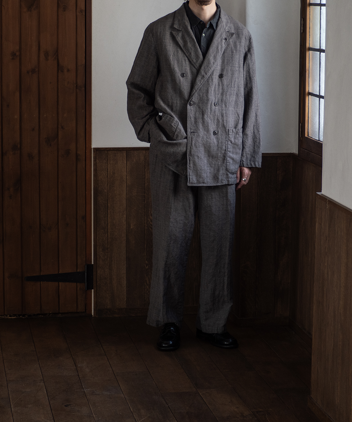 울 린넨 혼방의 헤링본 원단으로 만든 투 턱 팬츠입니다.