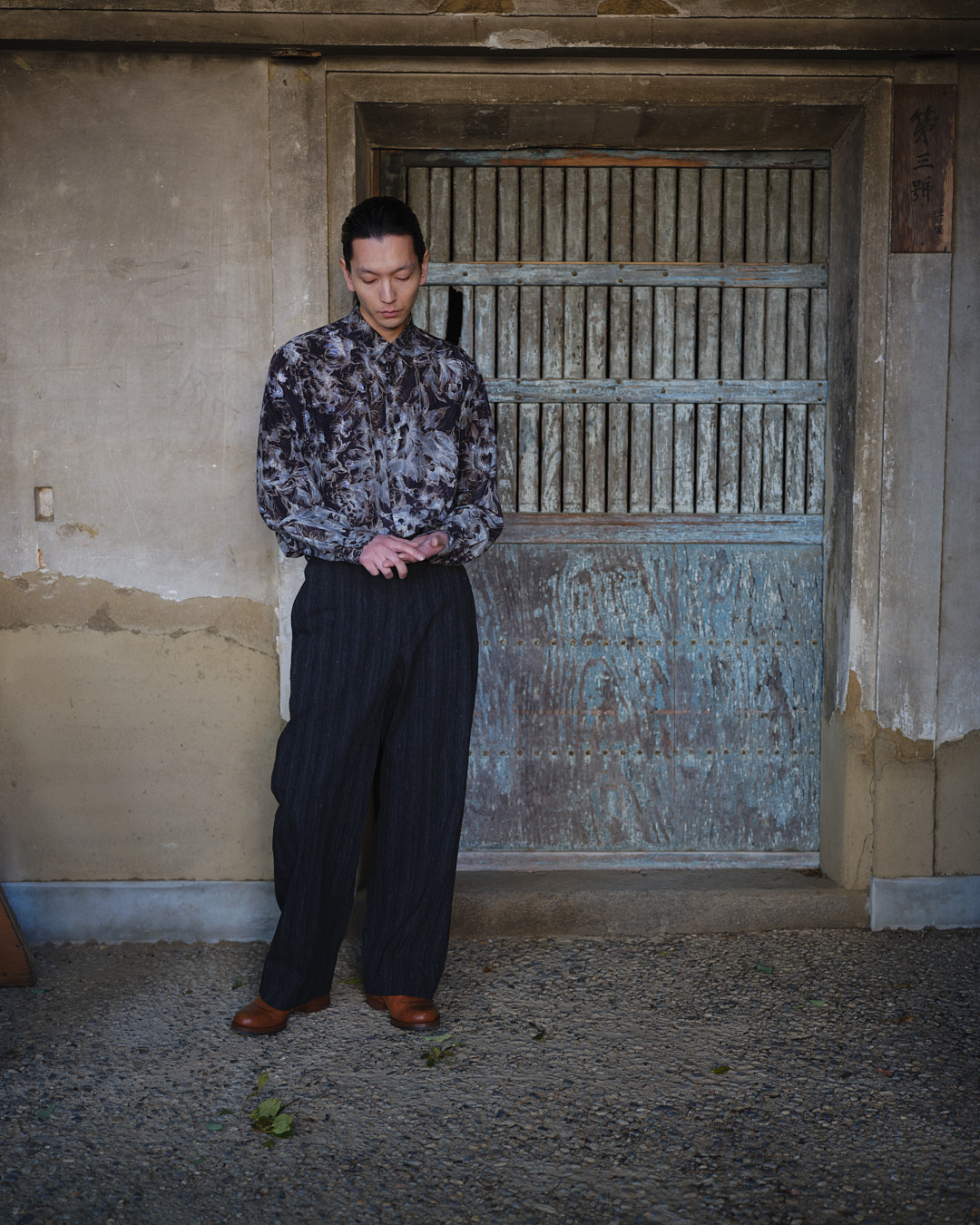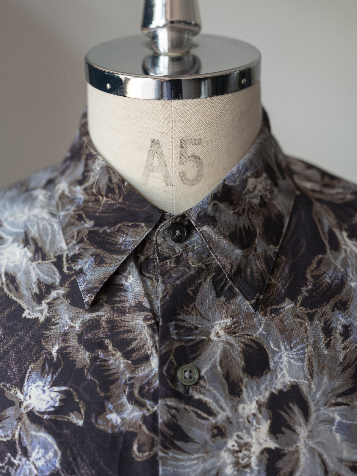 경사에는 실크사, 위사에는 큐프로 방사사를 사용한 평직 원단(산지 : 직조는 호쿠리쿠 → 정련은 야마가타 → 프린팅은 교토)으로 만든 셔츠입니다. 은은한 광택과 매끄러운 터치가 특징입니다.
