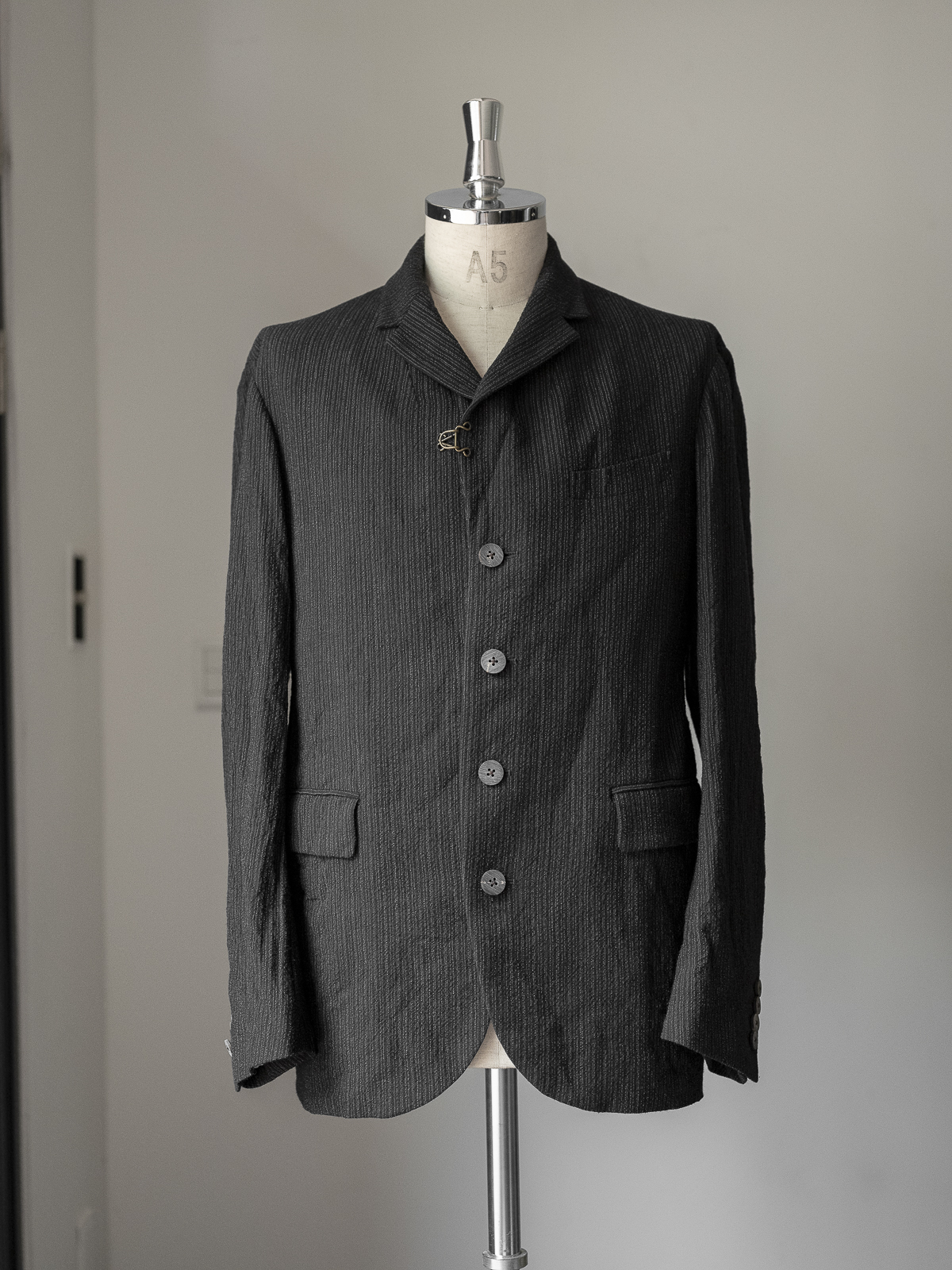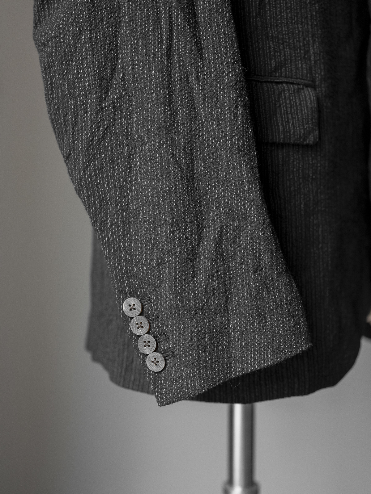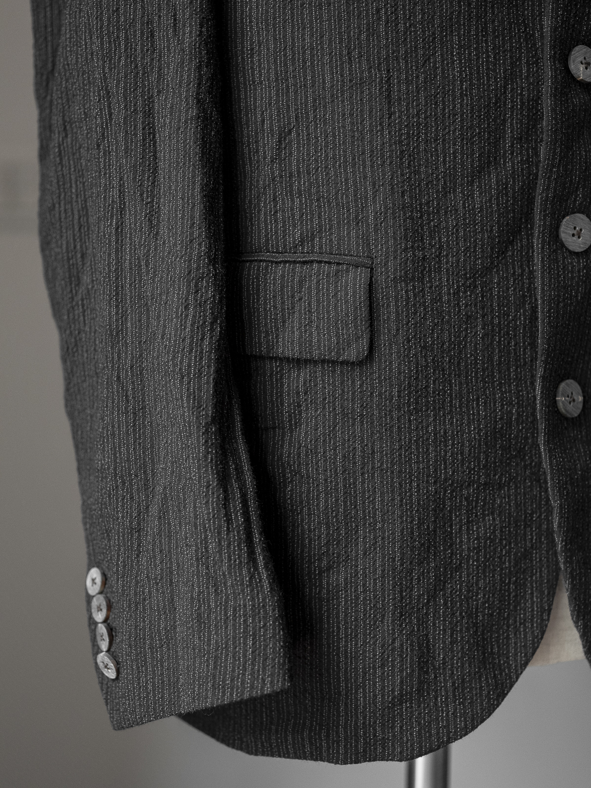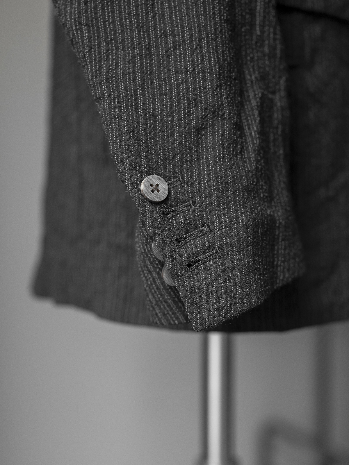 경·위사에 2/48 SZ 하이 트위스트 울사, 스트라이프 부분에는 2/48 S 하이 트위스트 울사를 사용해 직조한 평직 원단(산지 : 일본 아이치현 비슈)으로 만든 자켓입니다.