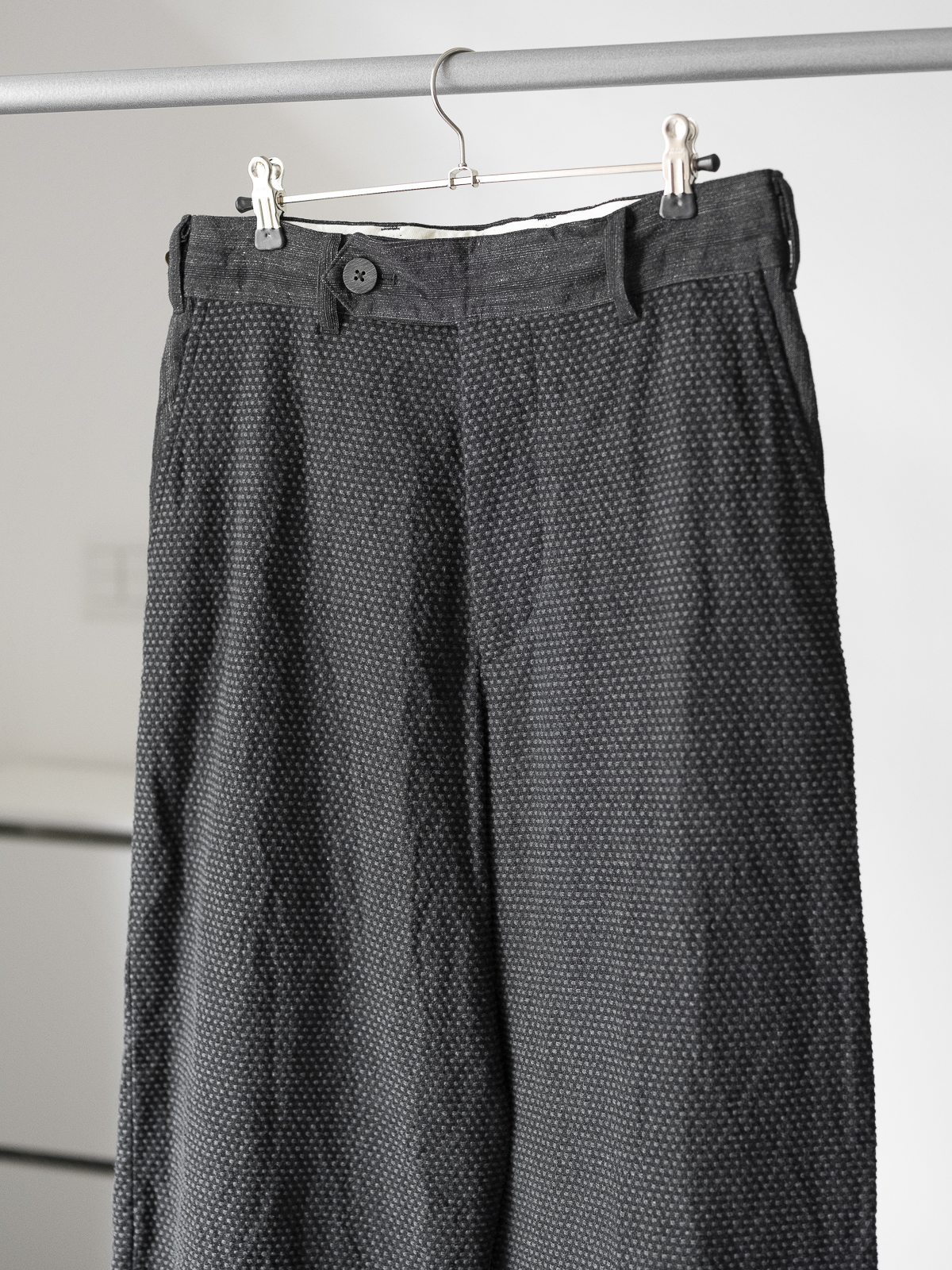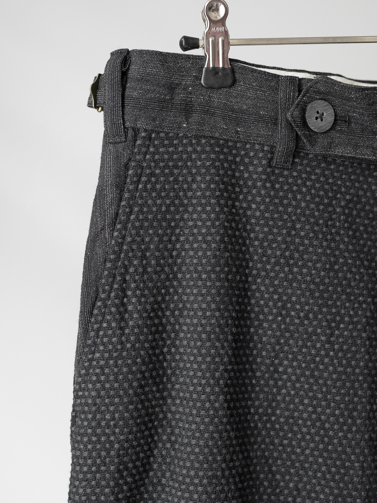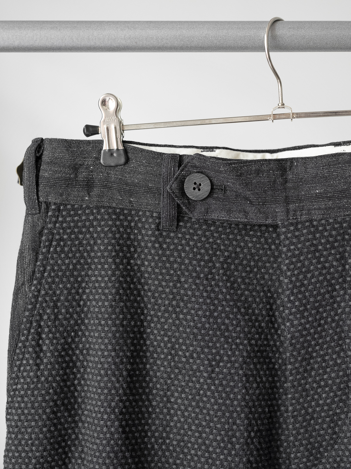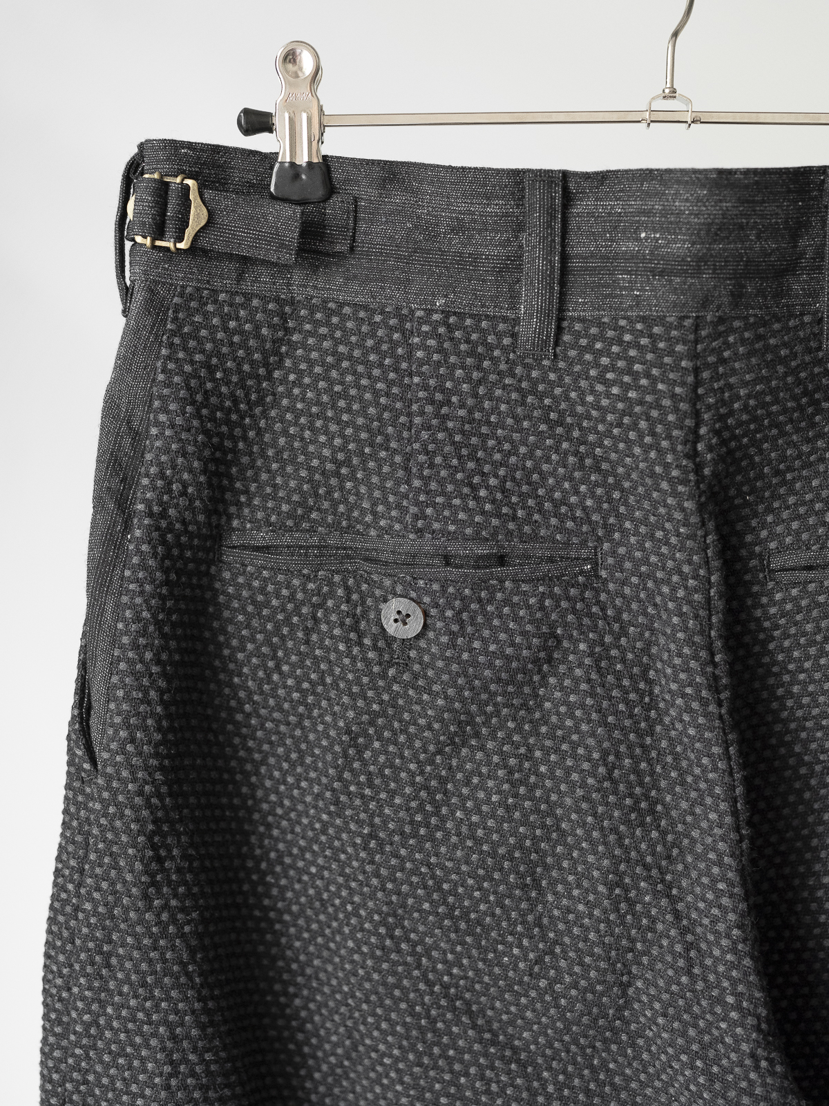 전통적인 일본 작업복과 프렌치 워크 팬츠에서 착안한 노플리츠 와이드 스트레이트 실루엣의 팬츠로, 두꺼운 벨트와 벨트 루프를 더해 구조적인 형태감을 주었으며, 벨트 부분과 안쪽 마감에는 캄렌스의 시그니처 원단인 울/코튼/린넨 소재의 대비 원단을 사용했습니다. 허리 조절이 가능한 사이드 어드저스터 사양입니다.