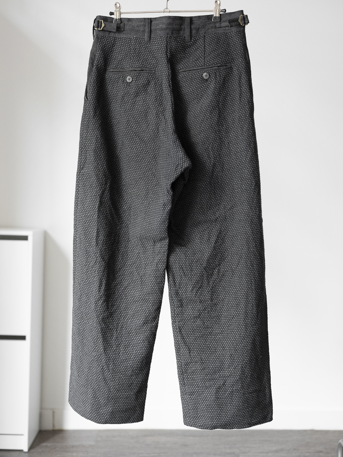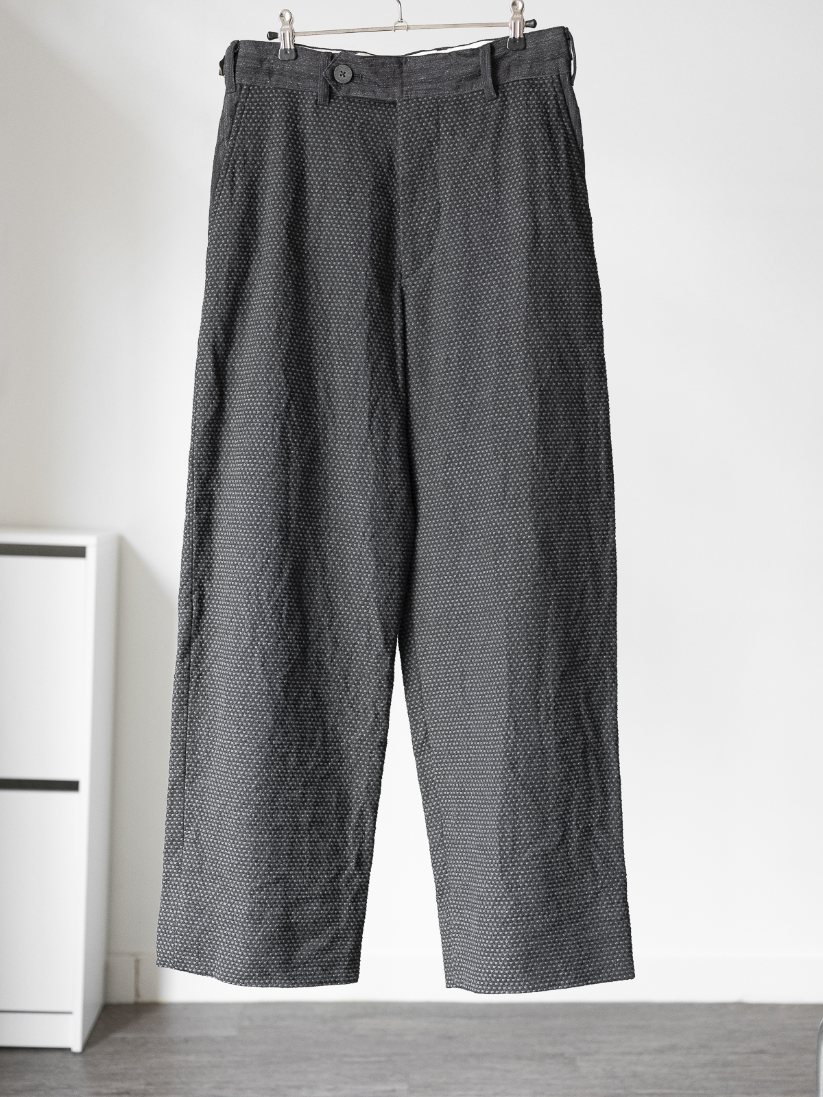 경사에는 6/1 블랙 코튼사, 위사에는 21/1 톱 그레이 코튼사를 사용해 직조한 원단(산지 : 일본 아이치현 비슈)으로 만든 사시코 팬츠입니다.