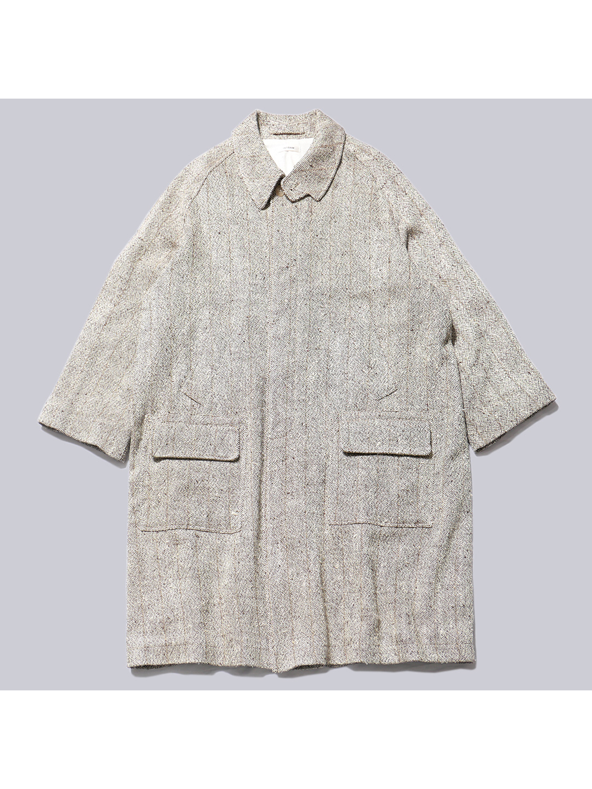 몸판과 기장을 넉넉히 설계한 A라인 중심의 싱글 래글런 코트 실루엣에, 핸드 워머 포켓의 위치를 과감히 끌어올리고 그 아래 플랩이 달린 대형 패치 포켓을 더해 전통적인 헌팅 웨어의 기능성과 현대적인 구조미를 동시에 담아냈습니다.