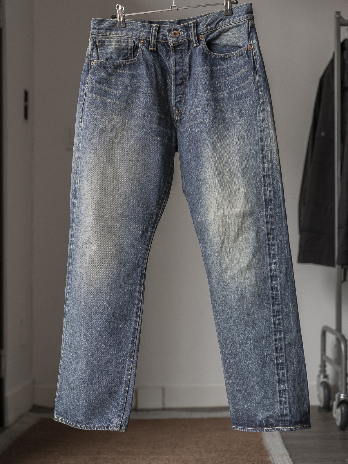 가공은 1940~50년대 XX 데님 중에서도 특히 균형이 뛰어난 개체의 분위기와 색감, 페이딩을 재현하는 데 초점을 맞춰, 샌딩, 블리치, 오버다이 등의 공정을 거쳤으며, 오랜 시간 착용해 충분히 에이징된 질감을 표현하기 위해 버튼에도 의도적으로 가공을 더했습니다.