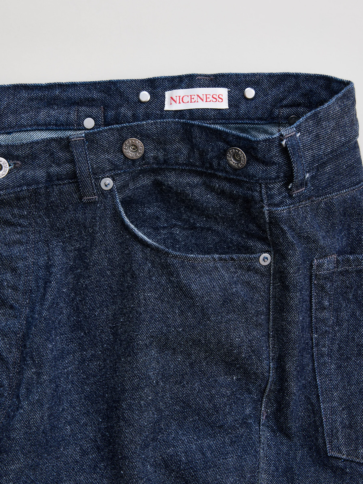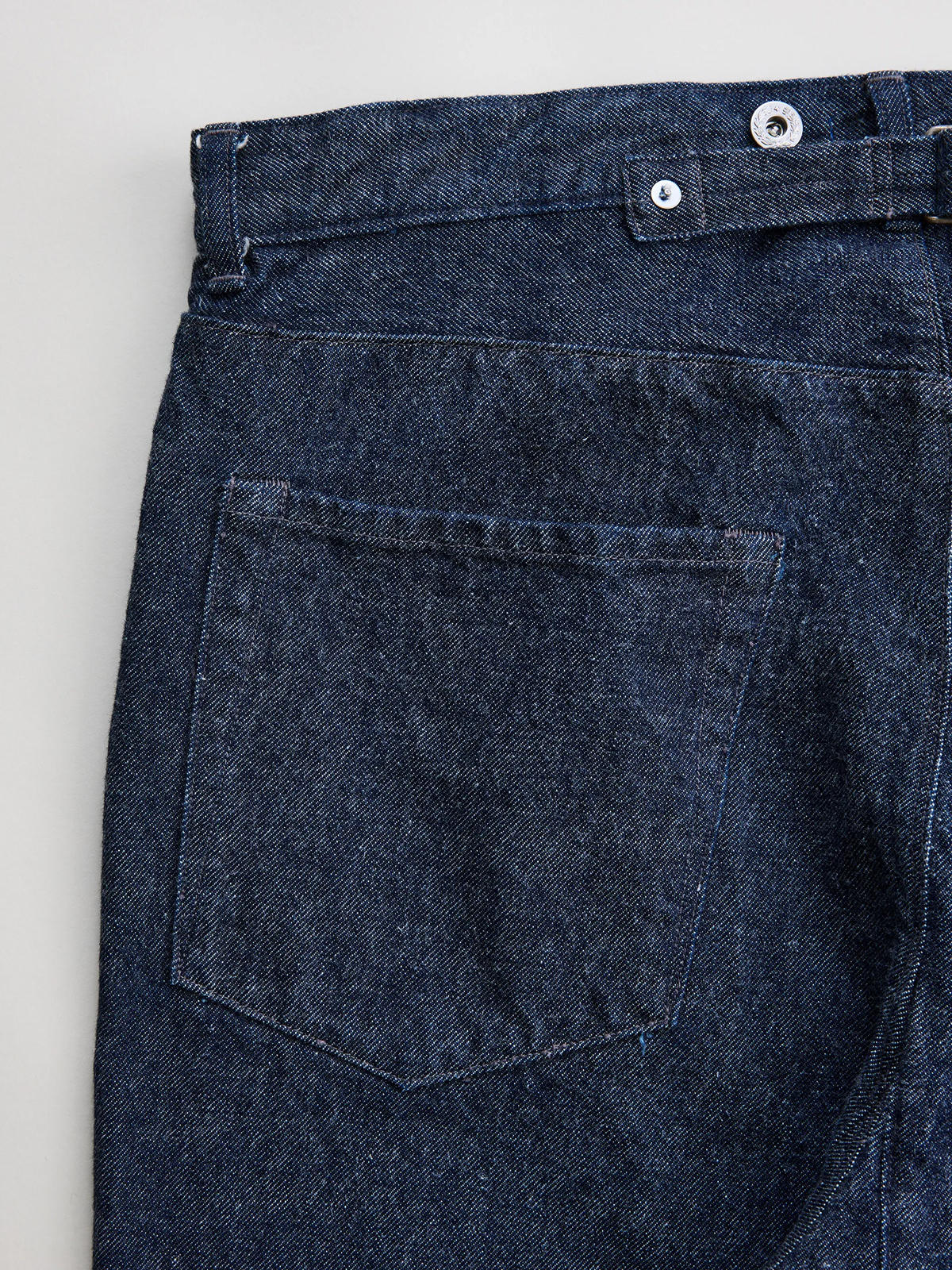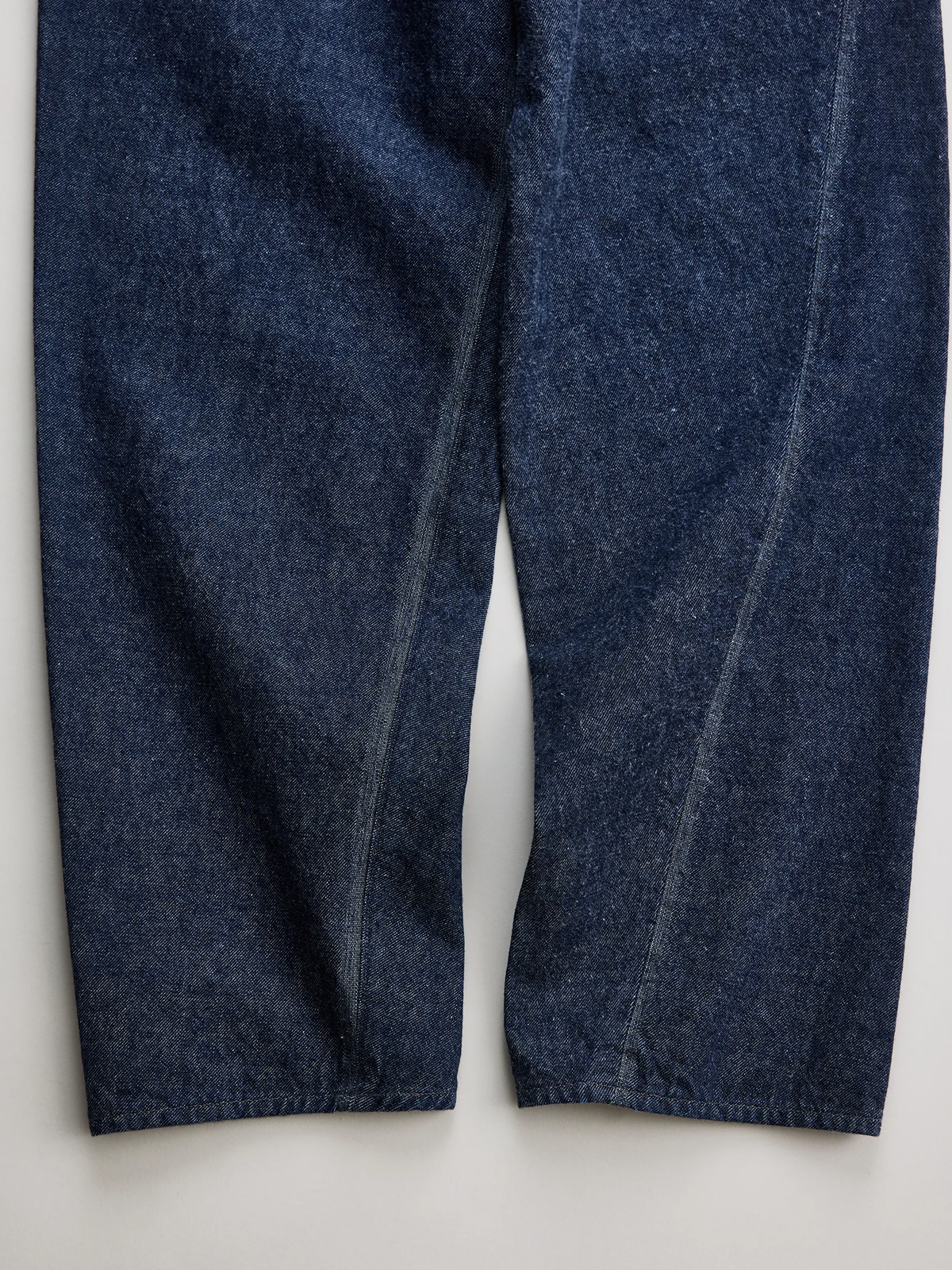 원단은 로프 염색으로 퓨어 인디고를 입힌 심백(芯白) 실을 사용했으며, 미국산 면을 중심으로 중남미의 고급 코튼을 블렌딩한 슬럽사로 직조했습니다. 균일하지 않은 실의 결이 만들어내는 깊이 있는 표정과 질감이 특징입니다. 또한 별도의 가공을 거치지 않은 생지 특유의 자연스러운 터치와 은은한 기모감이 살아 있어, 착용을 거듭할수록 뚜렷한 색감 변화와 입체적인 페이딩을 경험할 수 있습니다.