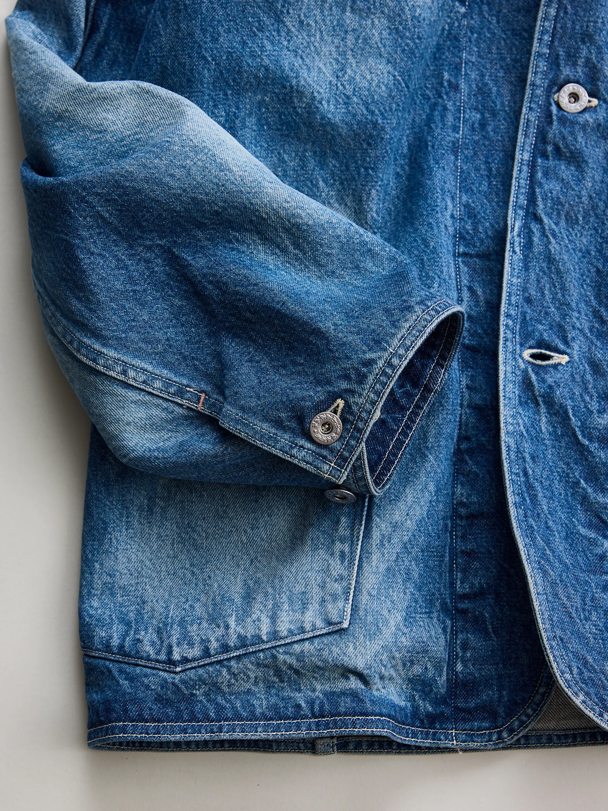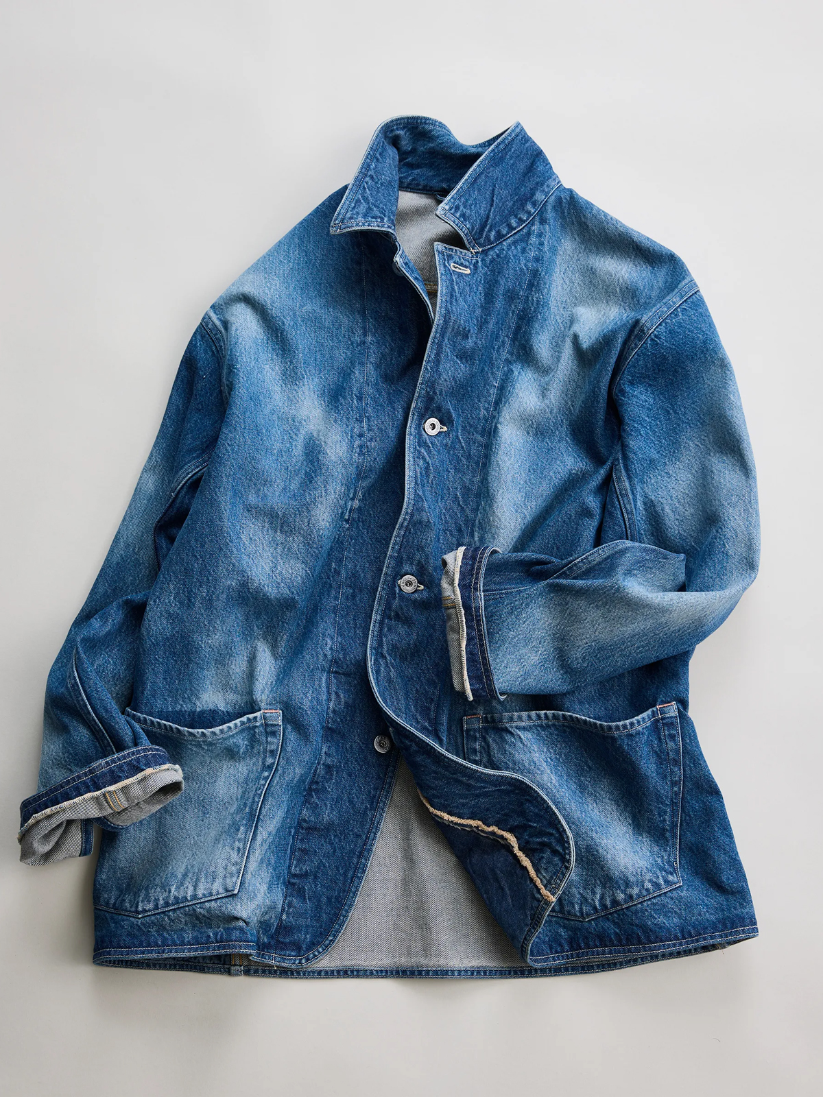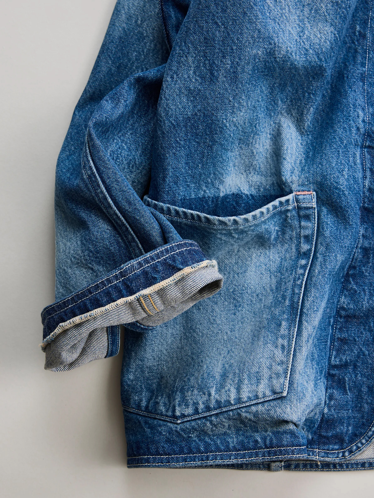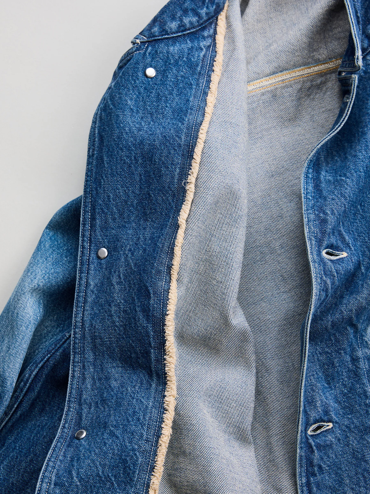 로프 다잉 방식으로 순수 인디고로 염색한 심백(芯白) 원사를 사용했으며, 자연스러운 슬럽감이 살아 있는 실로 직조해 은은한 기모감과 거친 질감을 동시에 표현했습니다.