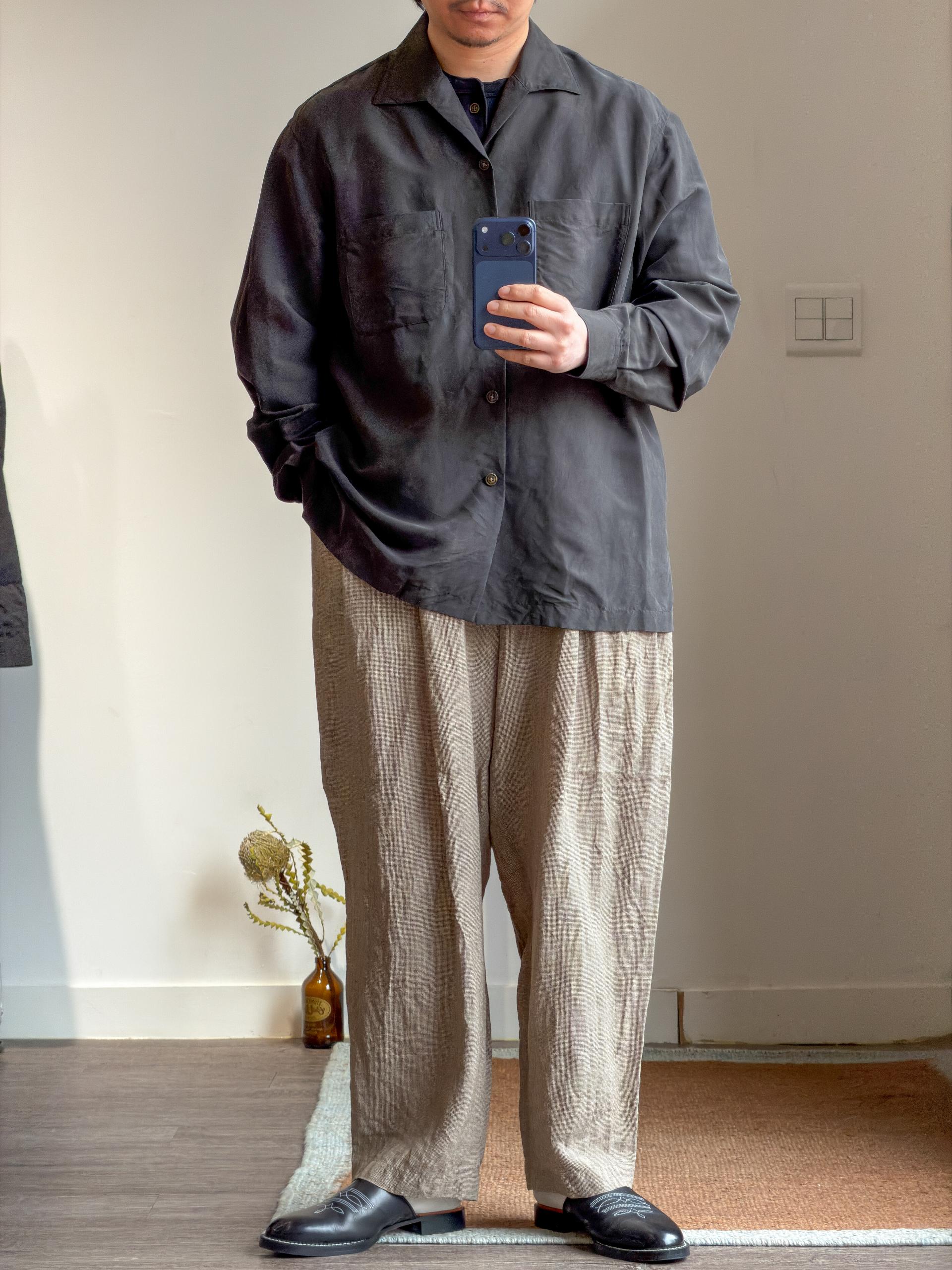 덕분에 실크의 고급스러운 광택이 과하게 번쩍이기보다 차분하게 눌리며, 캐주얼한 균형 안에서 독특한 고급스러움이 드러납니다.