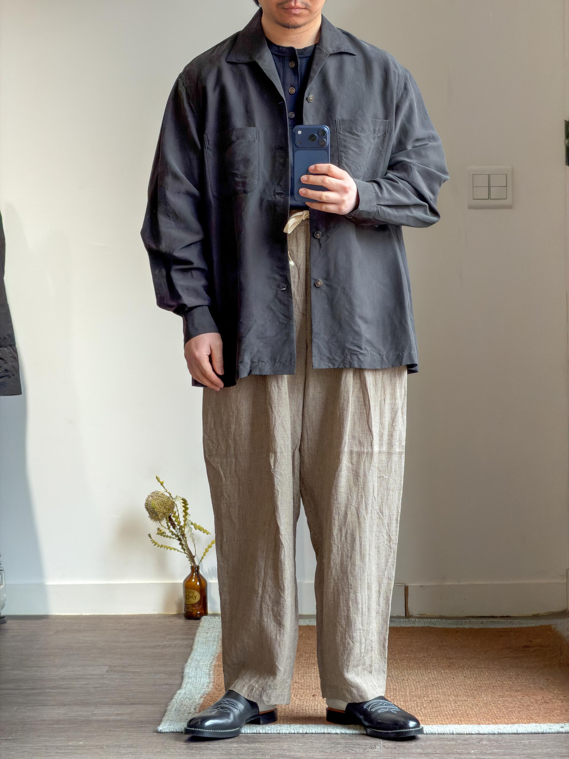 완성 후에는 한 벌씩 제품 워싱을 진행하고 천일 건조로 마무리해, 결의 풍성함과 빈티지한 분위기를 더 끌어올렸고, 버튼에는 물소뿔 단추에 소성(焼き) 가공을 더해 도자기처럼 단단하고 매트한 질감을 구현했습니다.