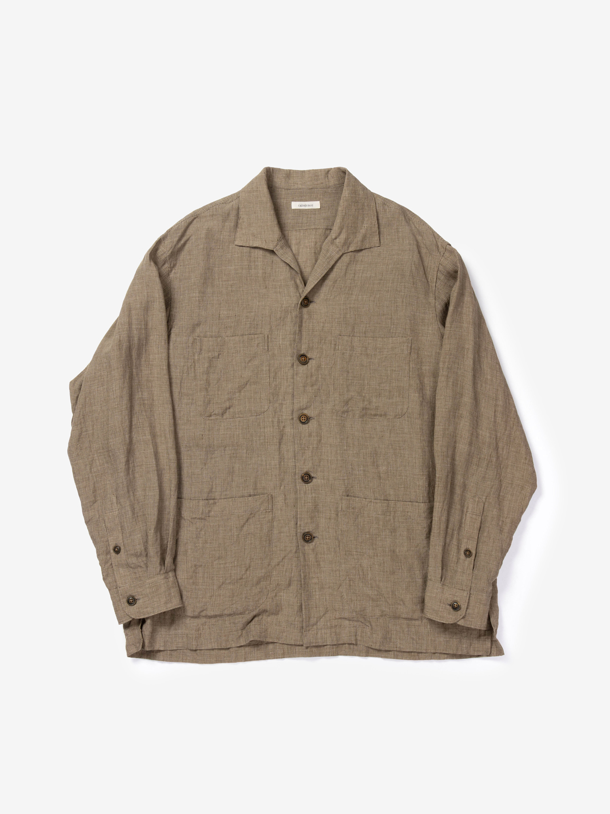 80수의 초극세 리넨 원사를 사용해, 내추럴한 미염색 실과 다크 카키로 염색한 실을 선염으로 짜 올린 하운드투스 조직이 특징인 셔츠 자켓입니다.