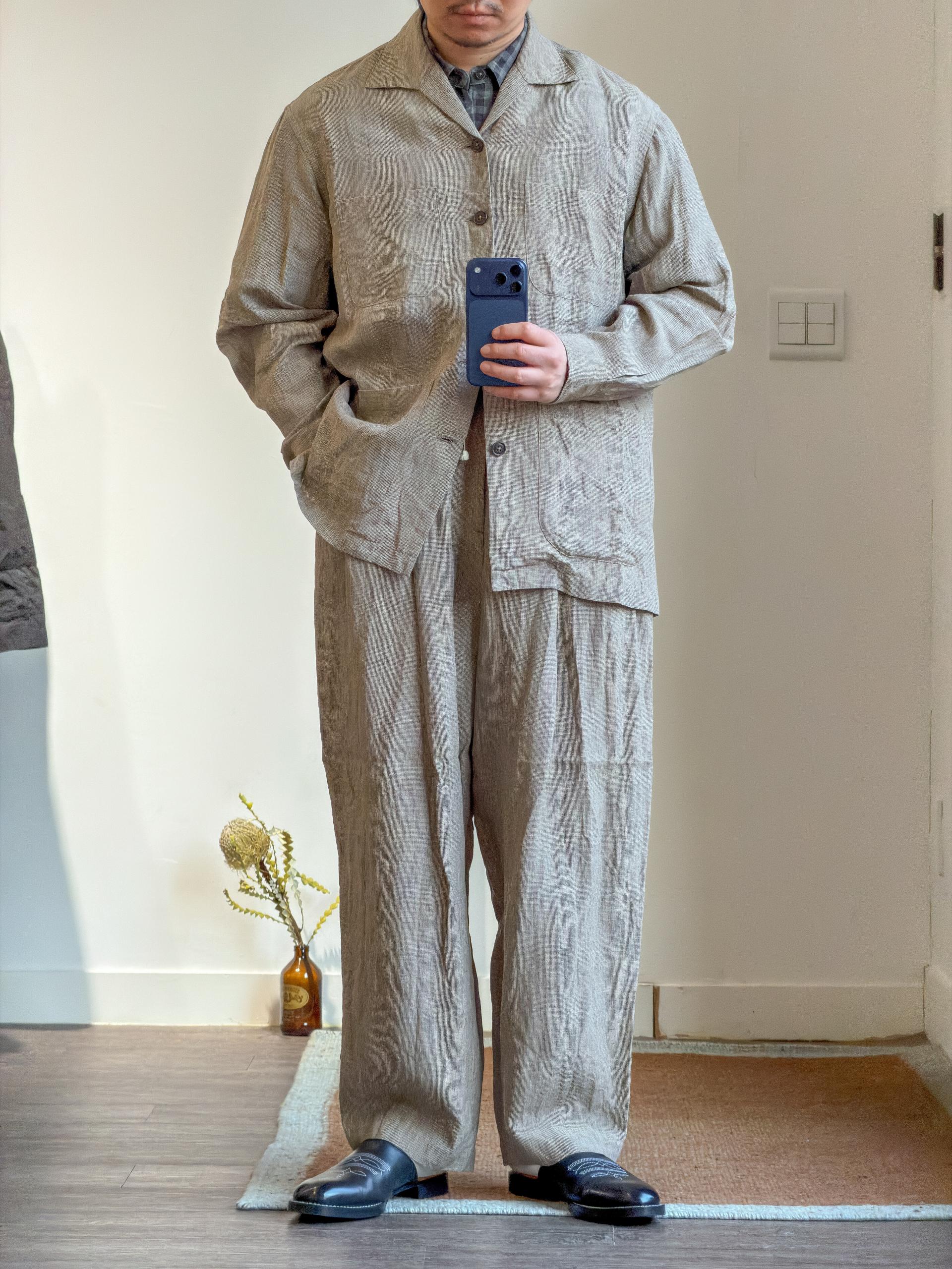 마감 후에는 정성스러운 손세탁과 천일 건조로 자연스러운 빈티지 뉘앙스를 더했으며, 버튼은 물소뿔 단추 표면에 소성(焼き) 가공을 더해 도자기처럼 단단하고 매트한 질감을 구현했습니다.