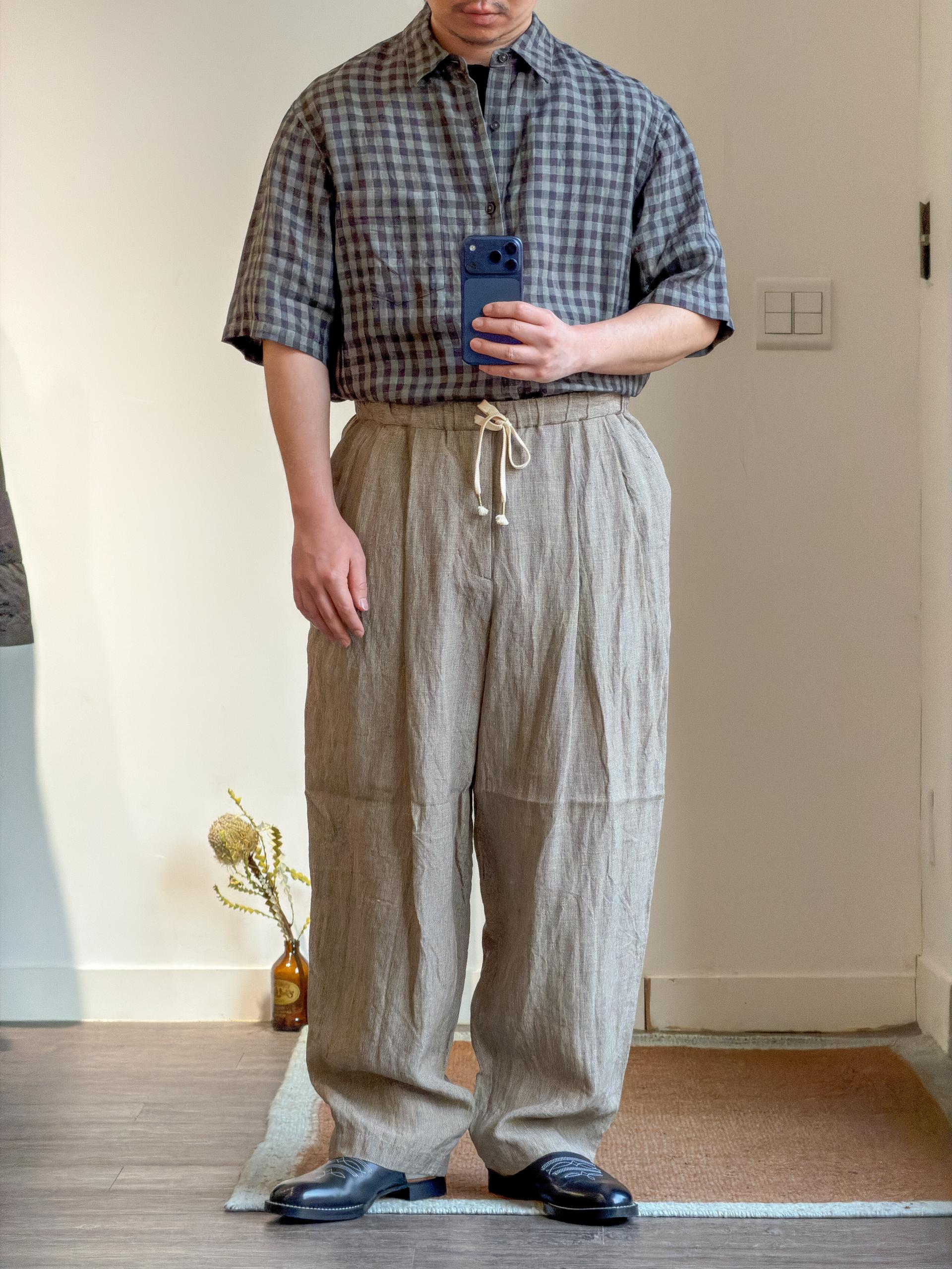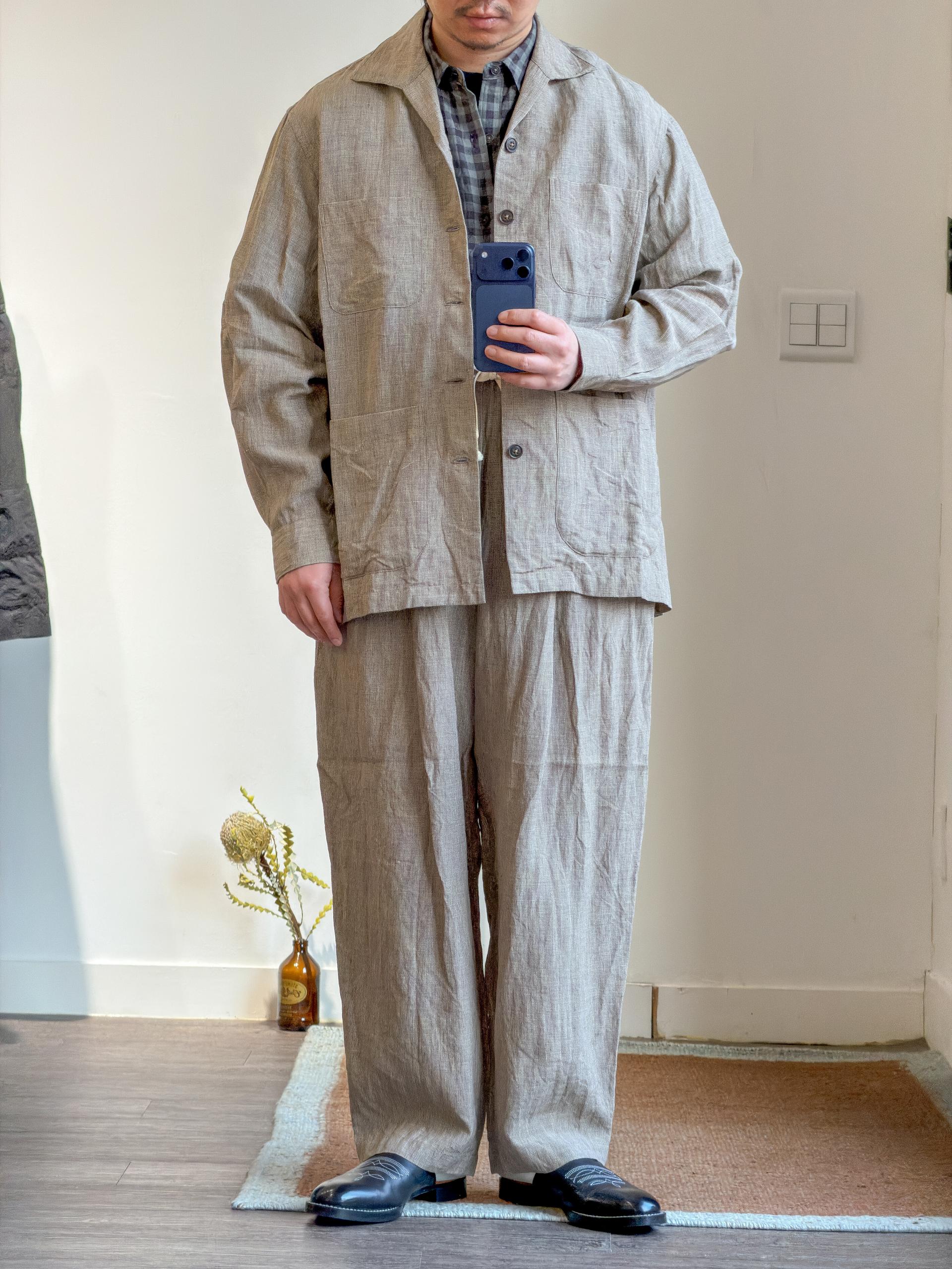 60수 린넨 원사를 사용해 제작된 이 깅엄 체크 원단은, 타래 염색(스킨 염색) 방식으로 두 가지 톤의 컬러를 구현해 깊이 있는 색감을 완성했습니다. 선염 과정에서 발생하는 미묘한 색의 농담과 불균일함은 패턴에 자연스러운 입체감을 더하며, 단순한 체크를 넘어 한층 세련되고 풍부한 표정을 만들어냅니다.