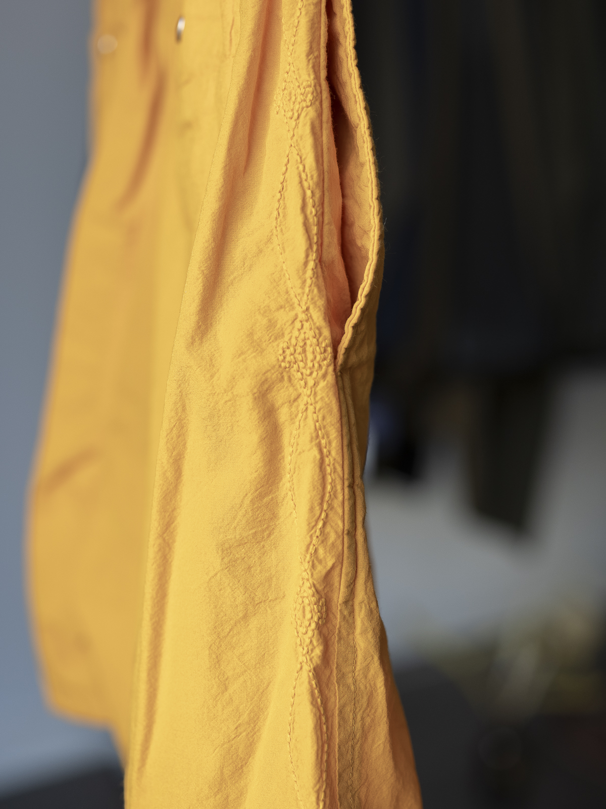 측면에는 SARTO의 시그니처 디테일인 50수의 가는 실을 7가닥으로 합사하여 중첩 스티치한 입체적인 자수를 배치했습니다. 미니멀한 구조 속에서도 은은한 깊이감을 더하는 요소로 작용합니다.