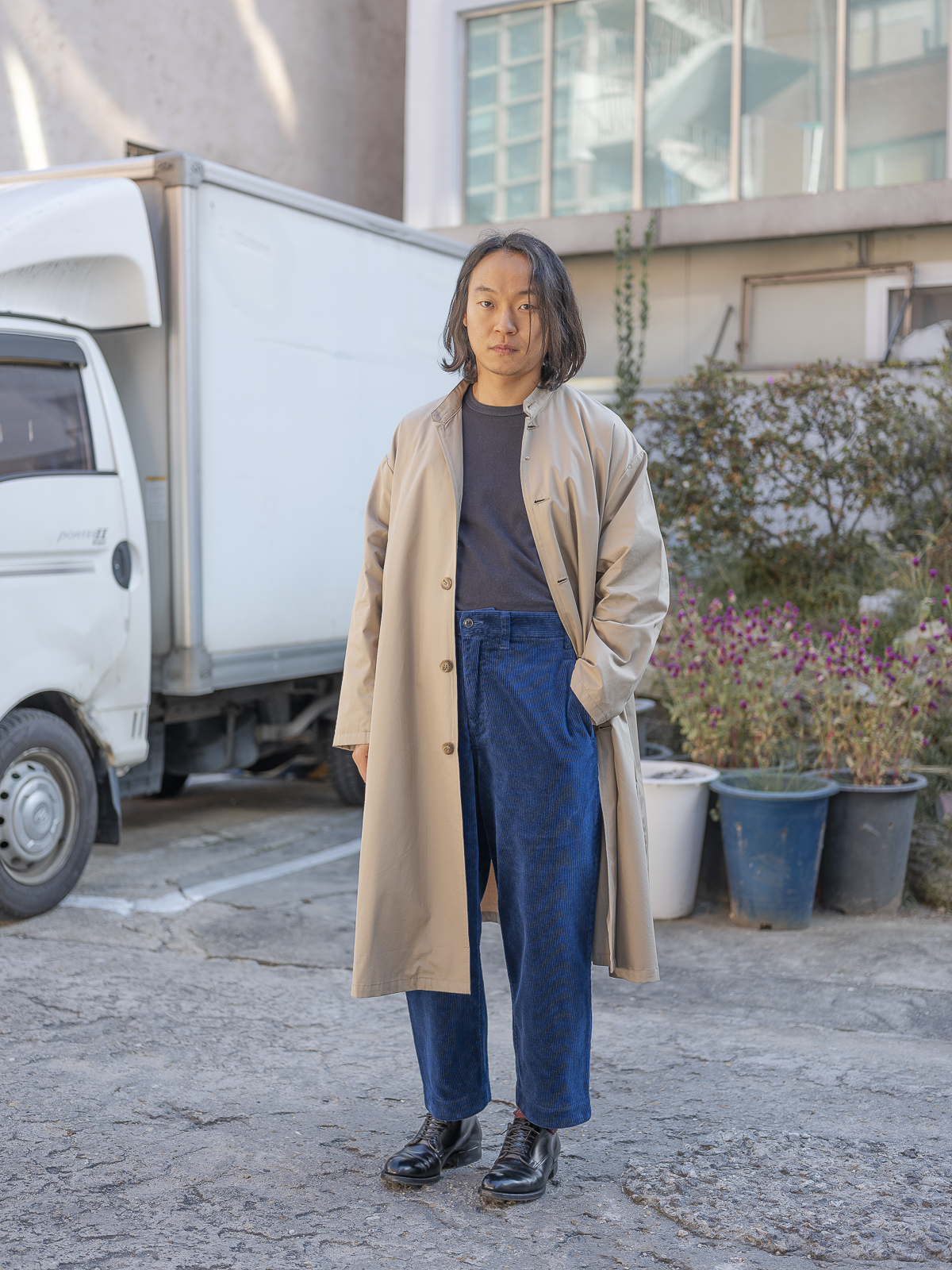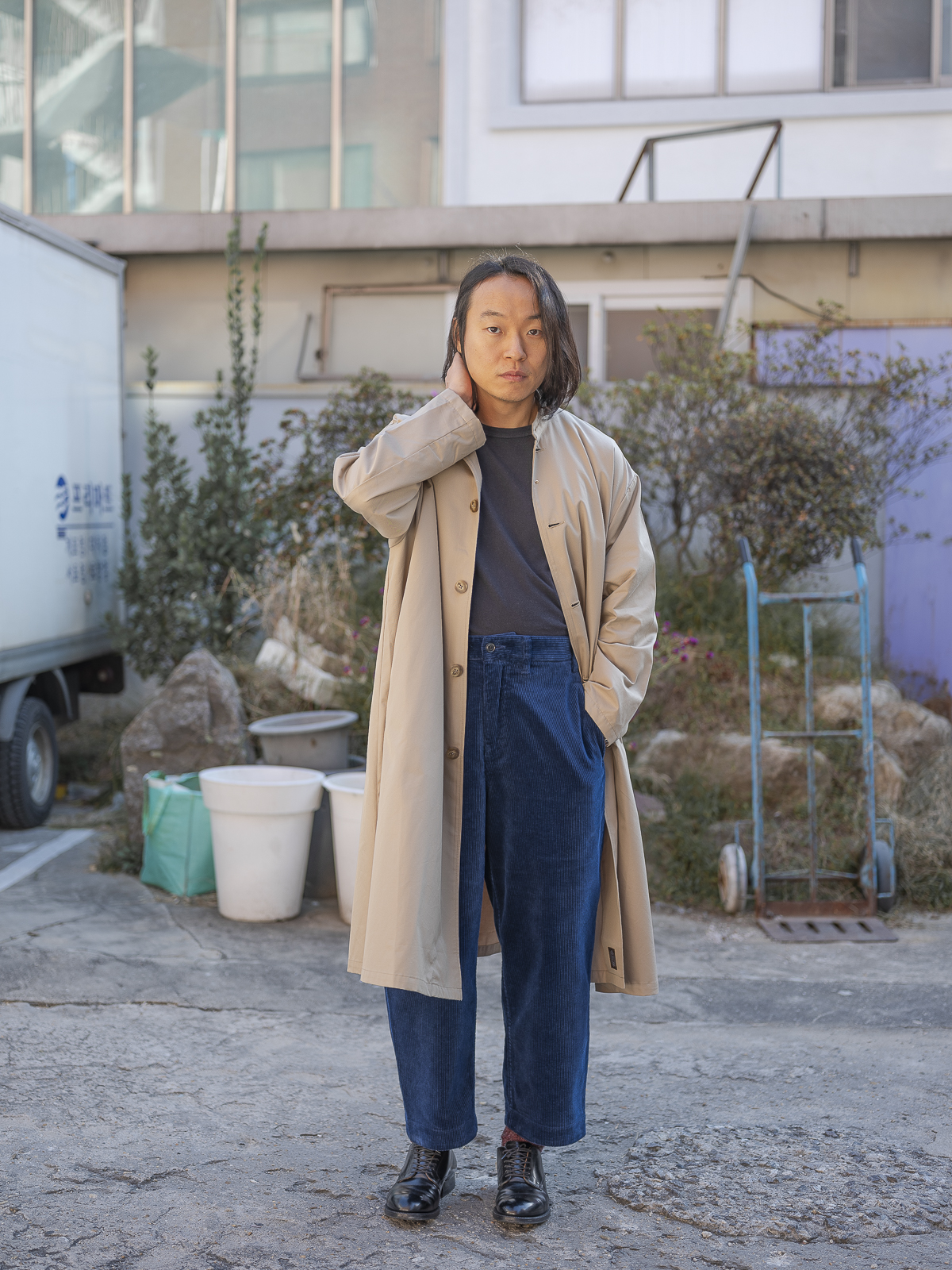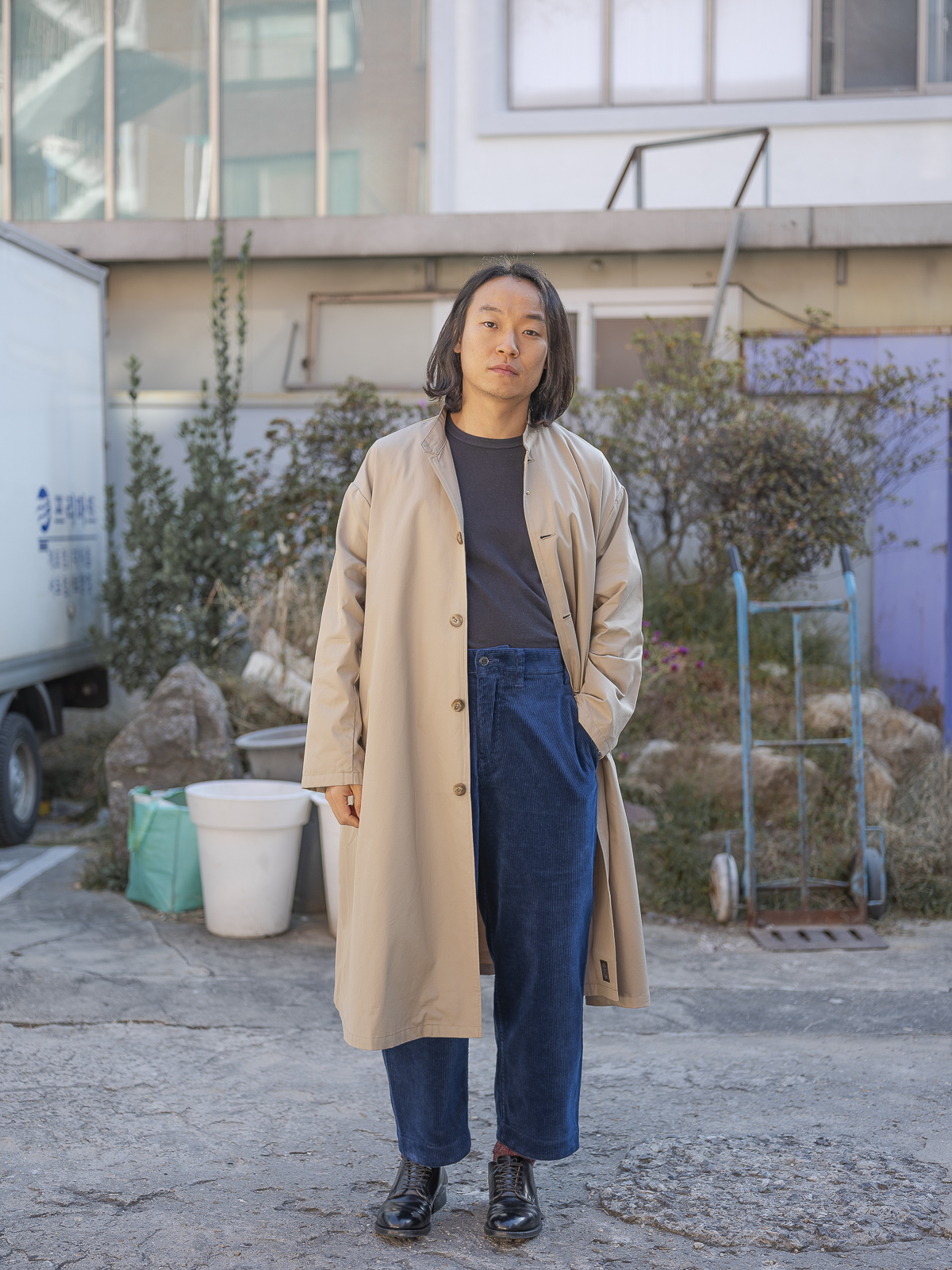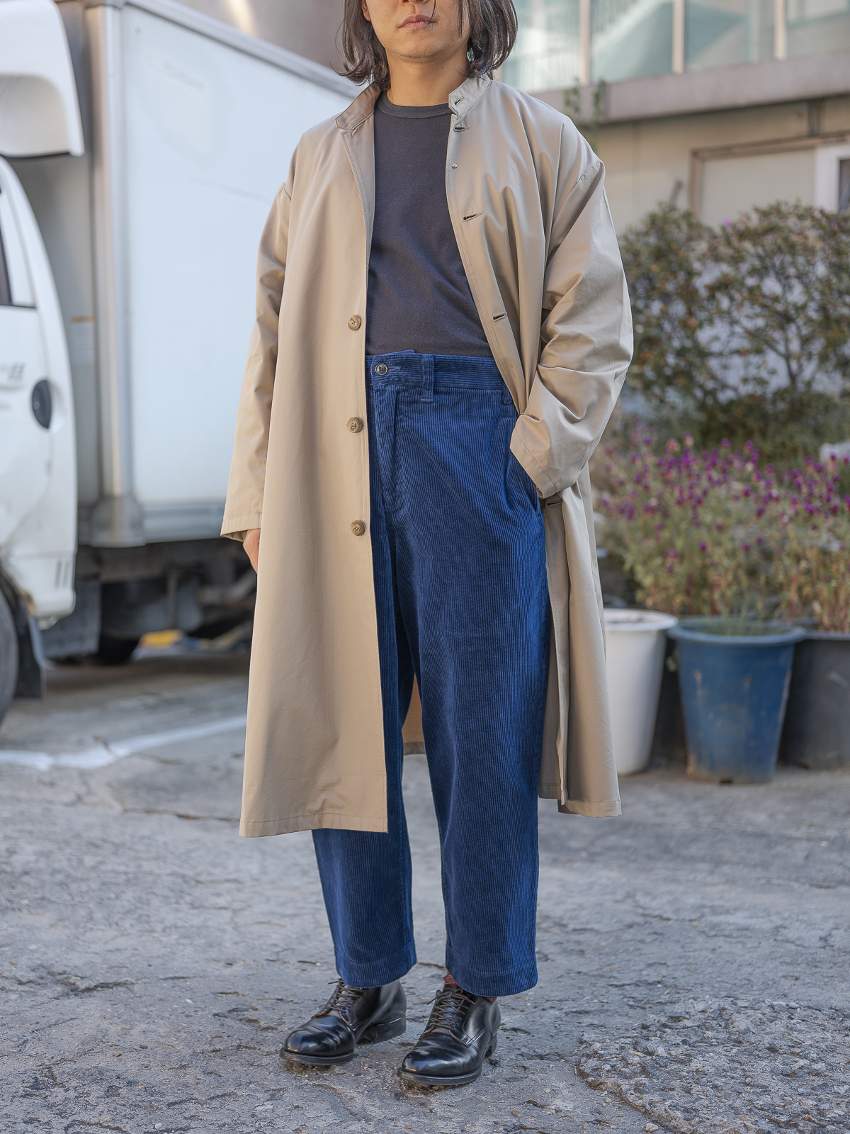 A라인으로 우아하게 퍼지는 실루엣이 아름다운 제품이며, 칼라는 일반적인 개버딘 코트와는 달리 스탠드 칼라로 되어 있어 독특하면서도 실용적입니다.