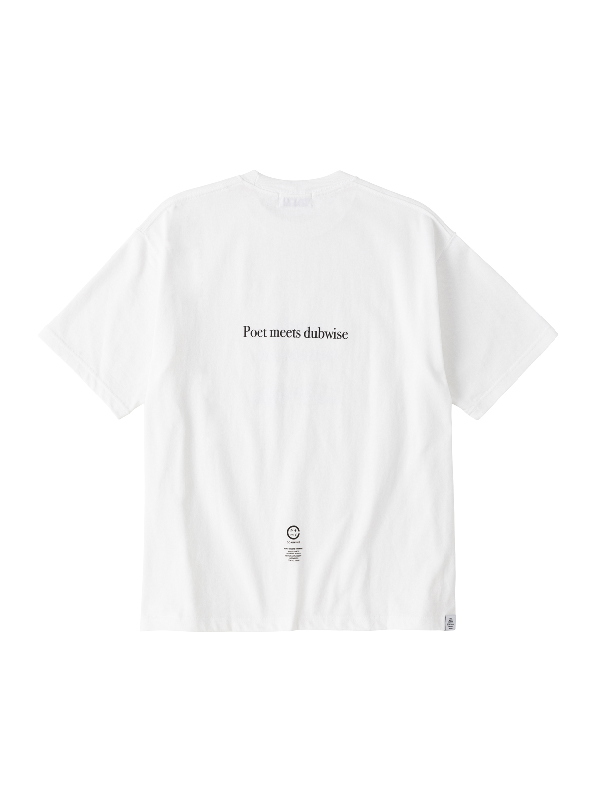 앞 부분에는 PMD+Commune를 상징하는 타이포그래피와 손을 마주 잡으려는 형상의 독특한 그래픽이 프린팅되어 있습니다. 여기서 Commune은 최소 단위의 행정구역(읍이나 면)을 뜻하는 프랑스어 '꼬뮌'에서 기원한 '공동체'라는 의미의 단어로, PMD+Commune은 PMD(Poet Meets Dubwise)를 통해 감성과 가치관을 공유하고 영향을 미치는 동료들의 모임이라는 의미입니다.