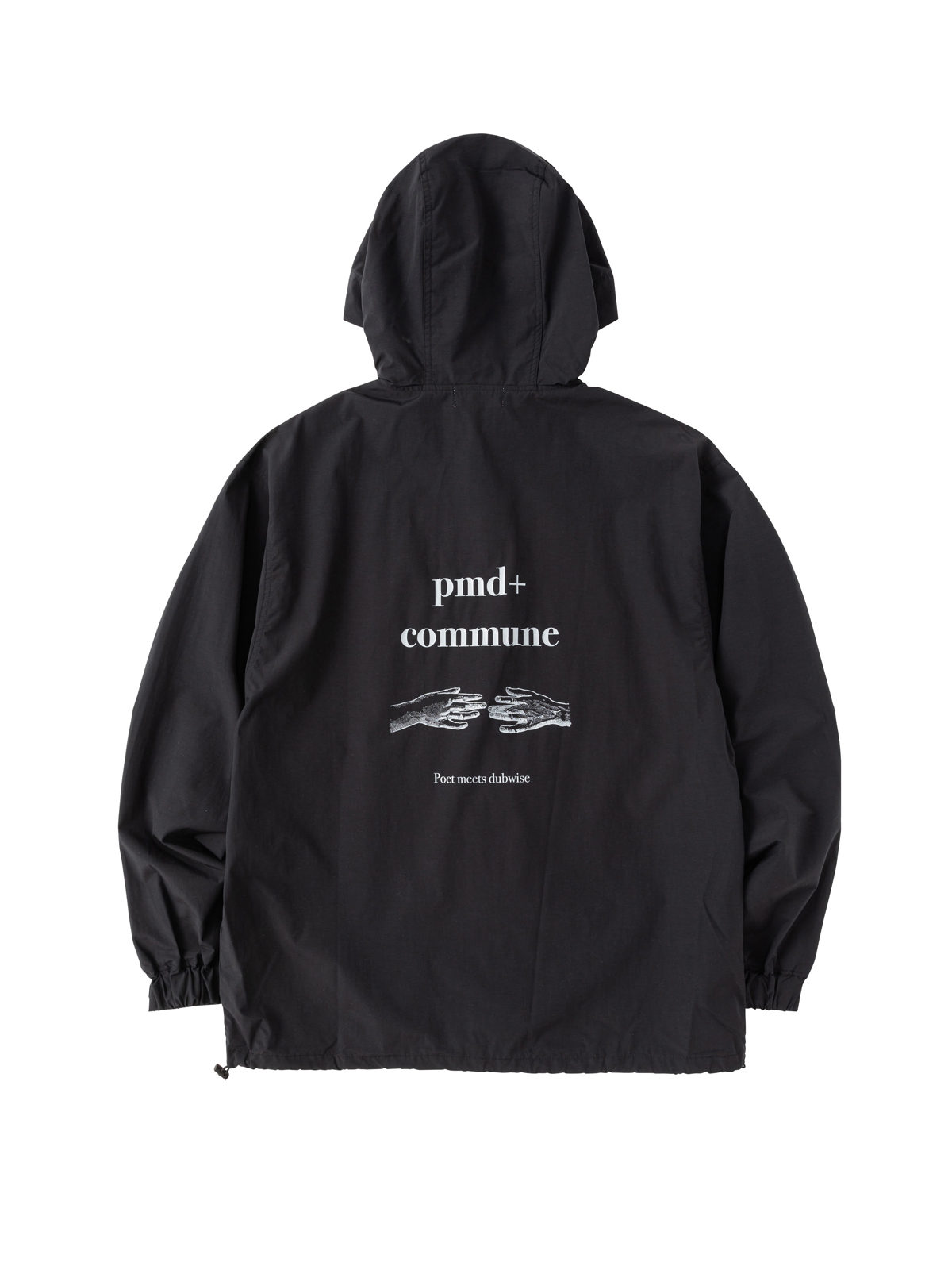 등 부분에는 PMD+Commune를 상징하는 타이포그래피와 손을 마주 잡으려는 형상의 독특한 그래픽이 프린팅되어 있습니다. 여기서 Commune은 최소 단위의 행정구역(읍이나 면)을 뜻하는 프랑스어 '꼬뮌'에서 기원한 '공동체'라는 의미의 단어로, PMD+Commune은 PMD(Poet Meets Dubwise)를 통해 감성과 가치관을 공유하고 영향을 미치는 동료들의 모임이라는 의미입니다.