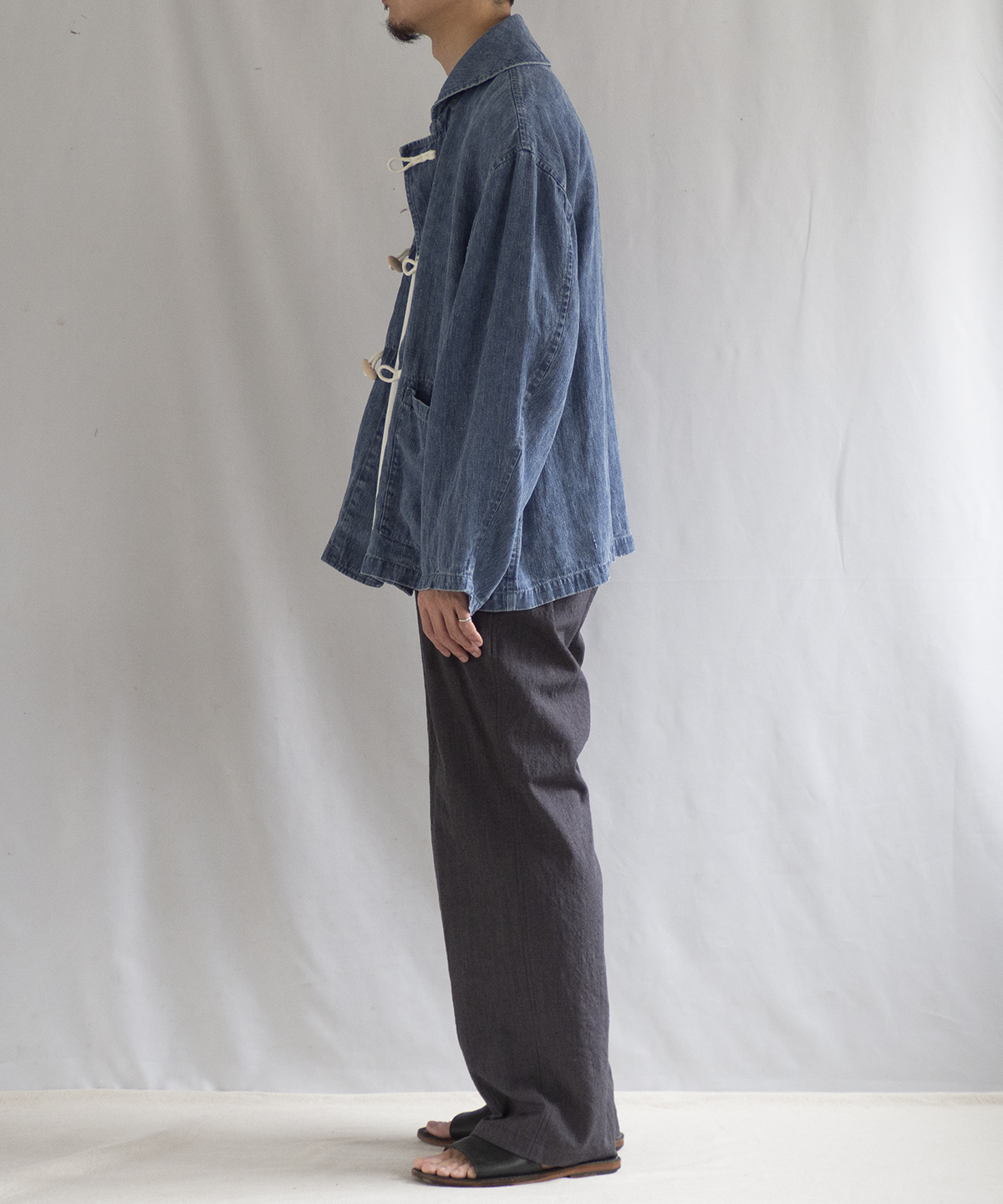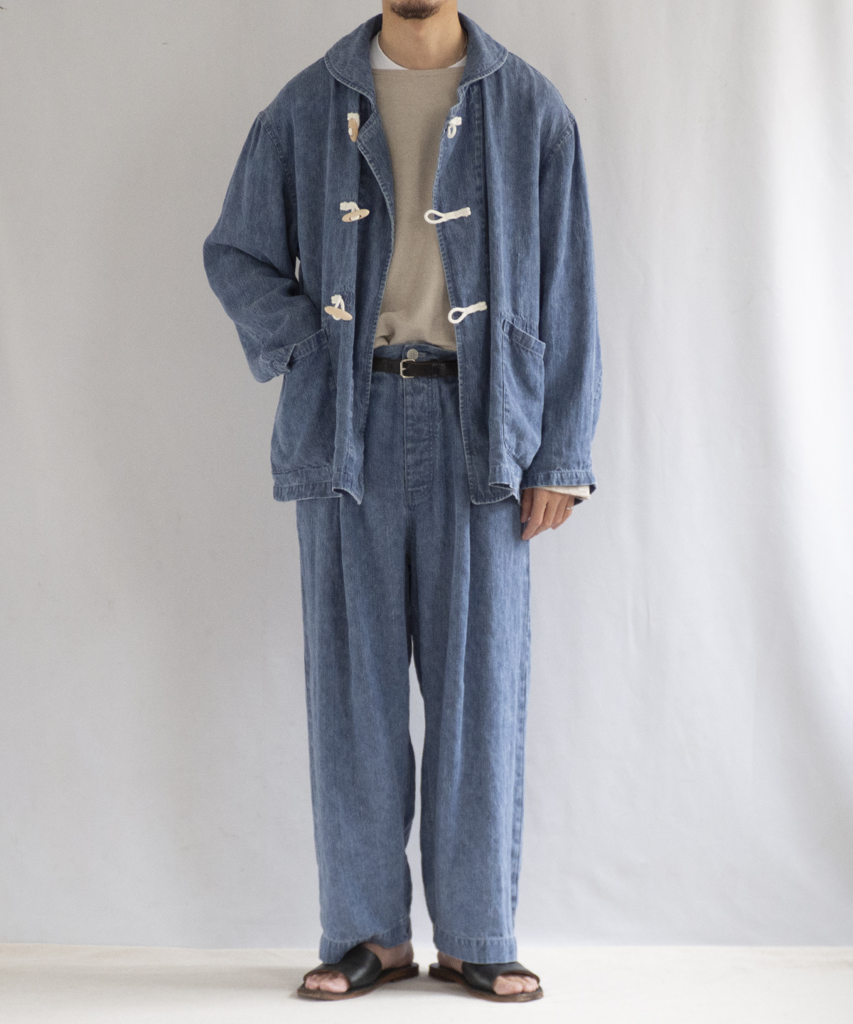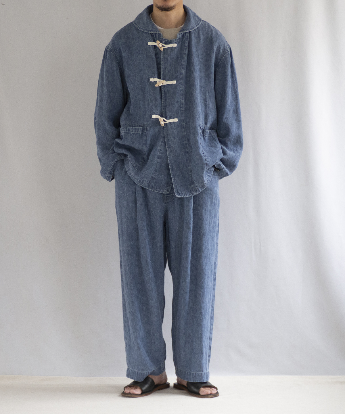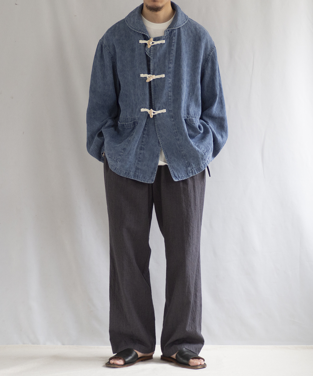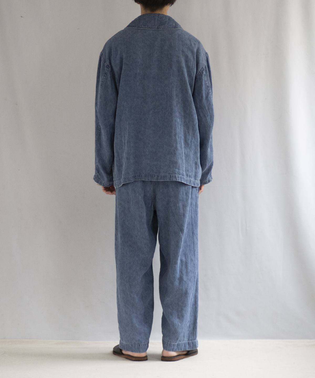 고품질의 린넨 실을 오카야마(岡山)에서 로프다잉(Rope Dyeing) 기법을 통해 인디고로 선염한 후, 오존 워싱(Ozone Decolorization)으로 자연스러운 색감을 냈습니다.