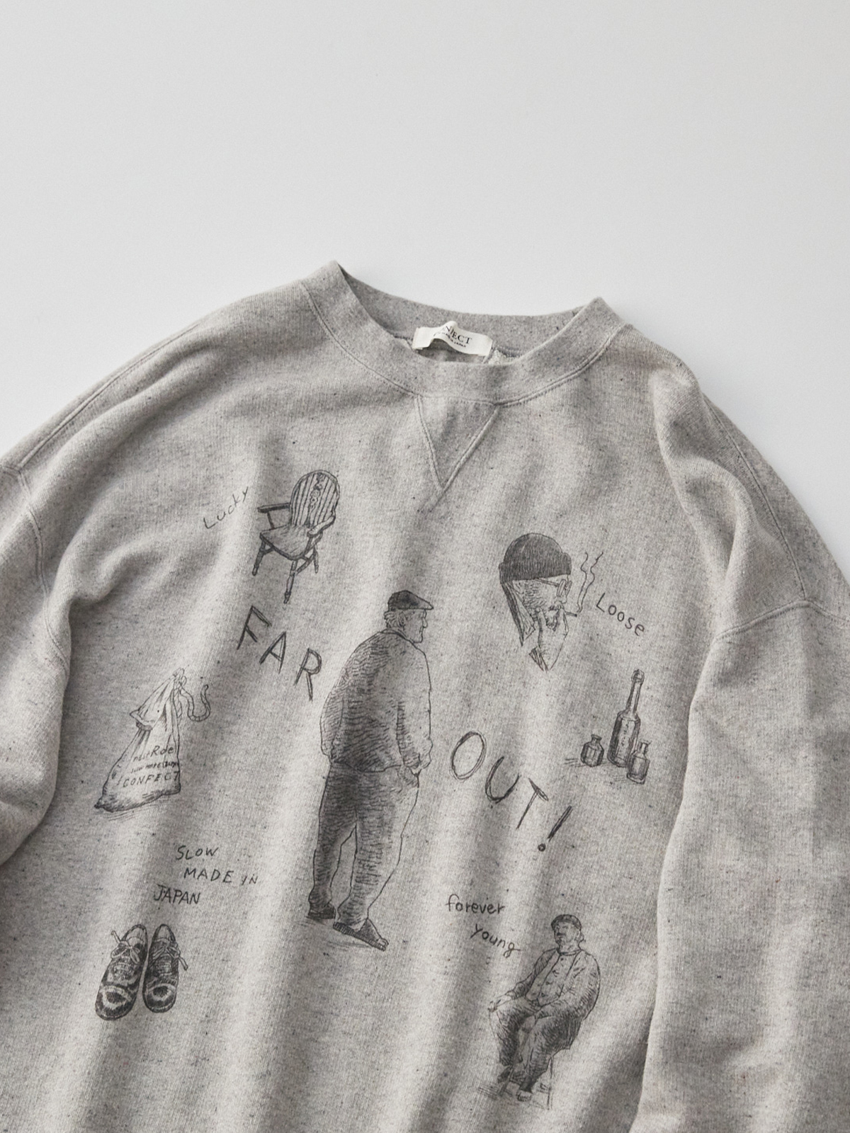 일러스트에는 네스트로브 컨팩트의 세계관에서 매우 중요한 OLDMAN(노인), 매장 안의 엔틱 가구들, 구두와 술병, 그리고 FAR OUT이라는 문구가 새겨져 있습니다. FAR OUT은 세련된 사람들을 가리키는 1960-70년대에 쓰였던 고어로 지금으로 따지면 COOL과 유사한 의미의 문구입니다. 지금은 거의 사용되지 않지만, 그래서 오히려 OLDMAN 모티브와의 접점이 있다고 생각하여 함께 삽입한 것입니다.