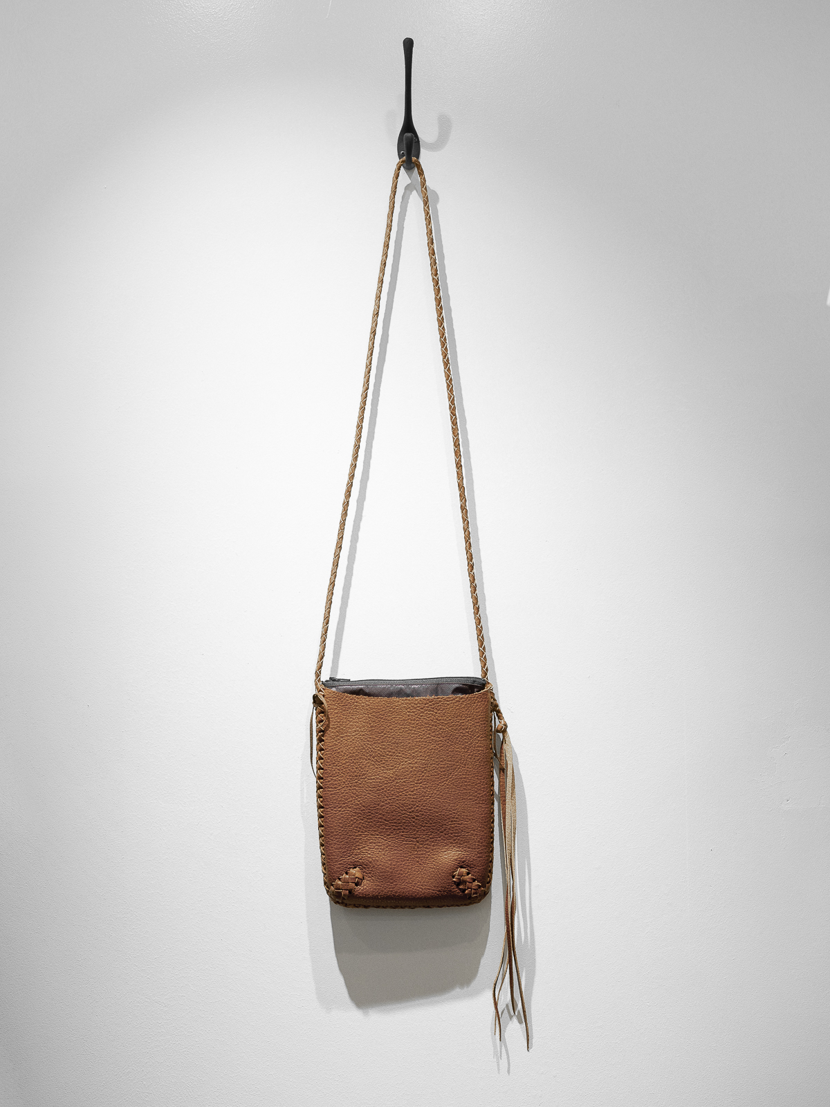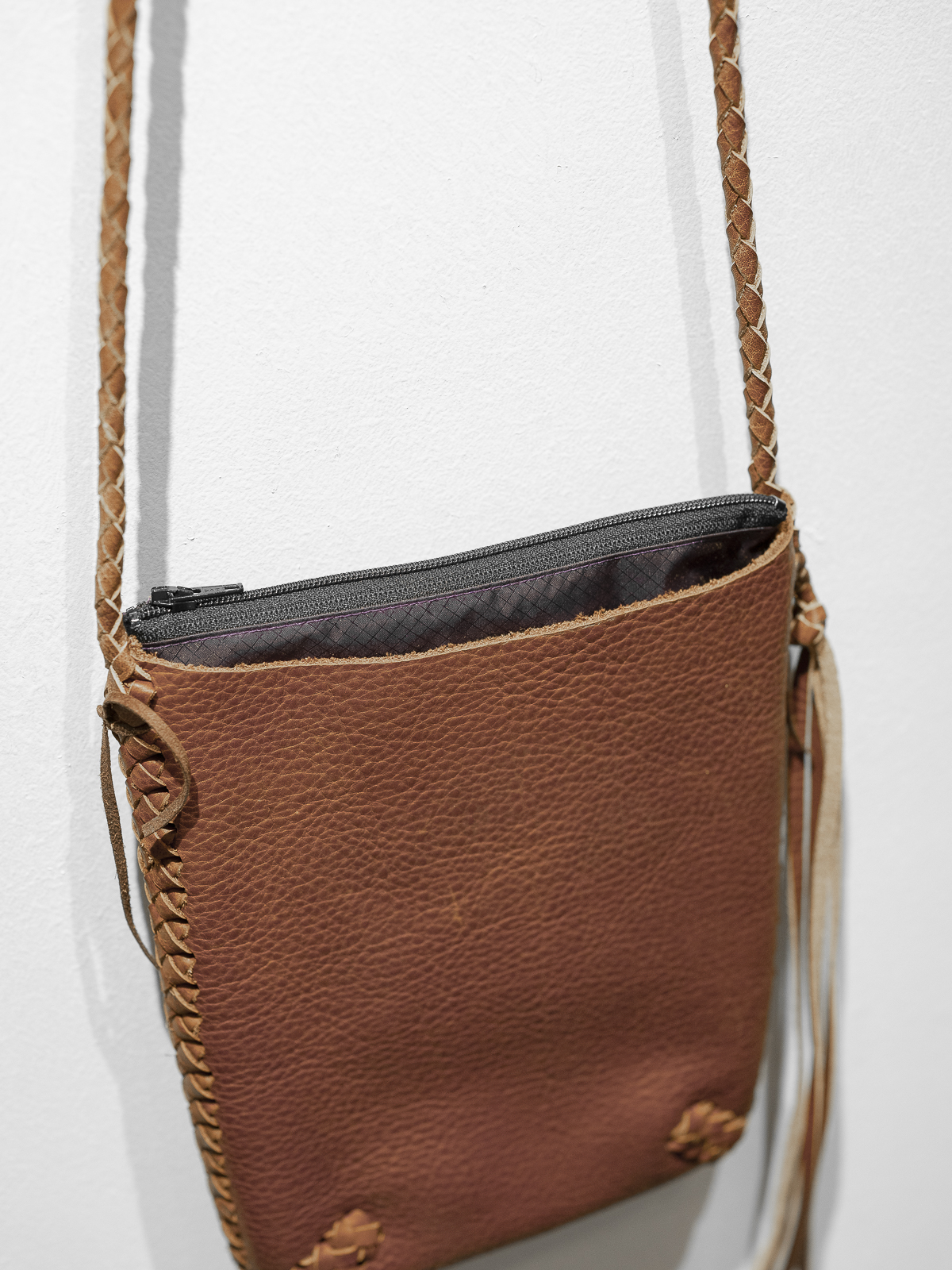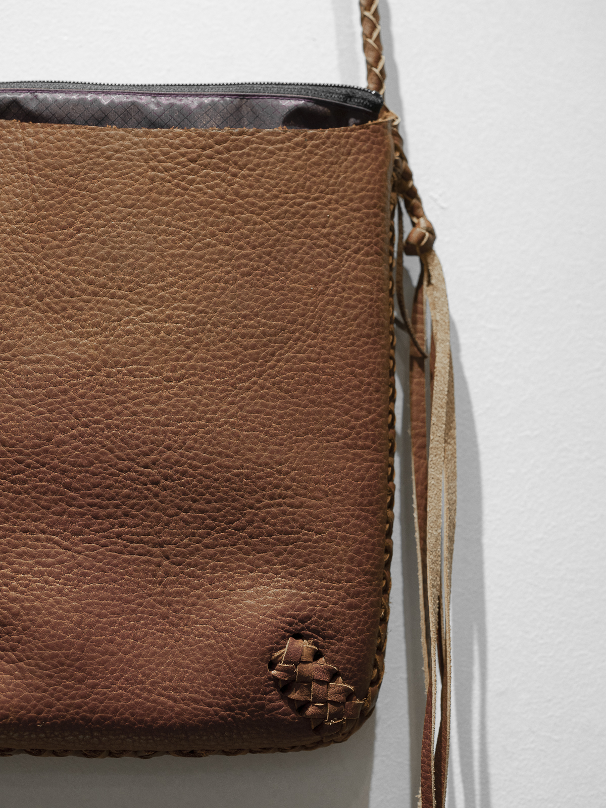 가방의 입구 부분을 제외한 모든 가장 자리 부분에는 손으로 엮어서 만든 가죽 꼬임 디테일이 있으며, 스트랩도 손으로 엮는 방식으로 제작하였습니다.