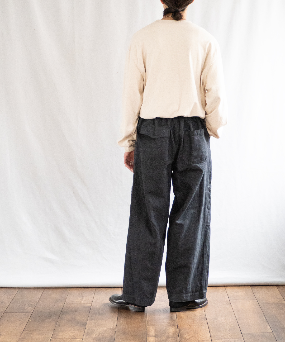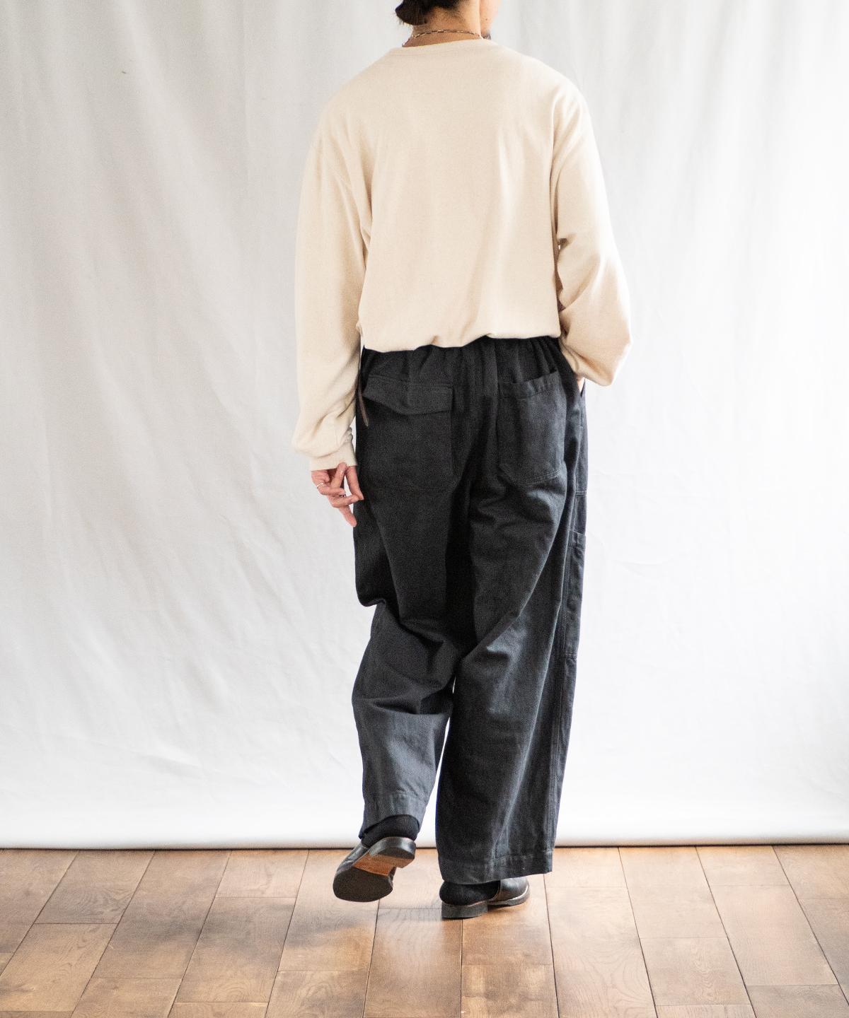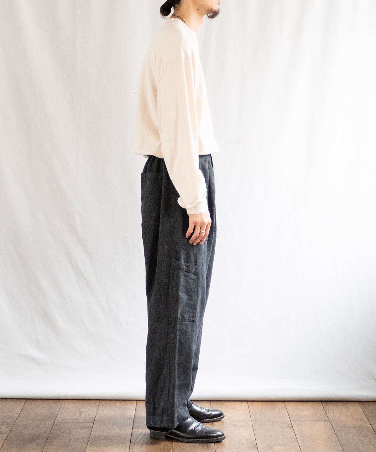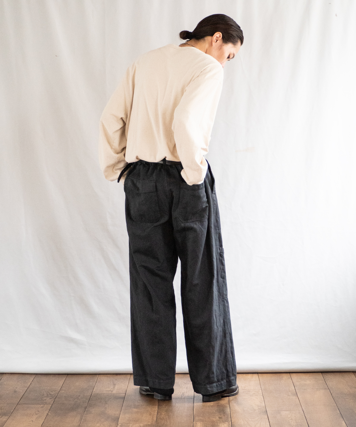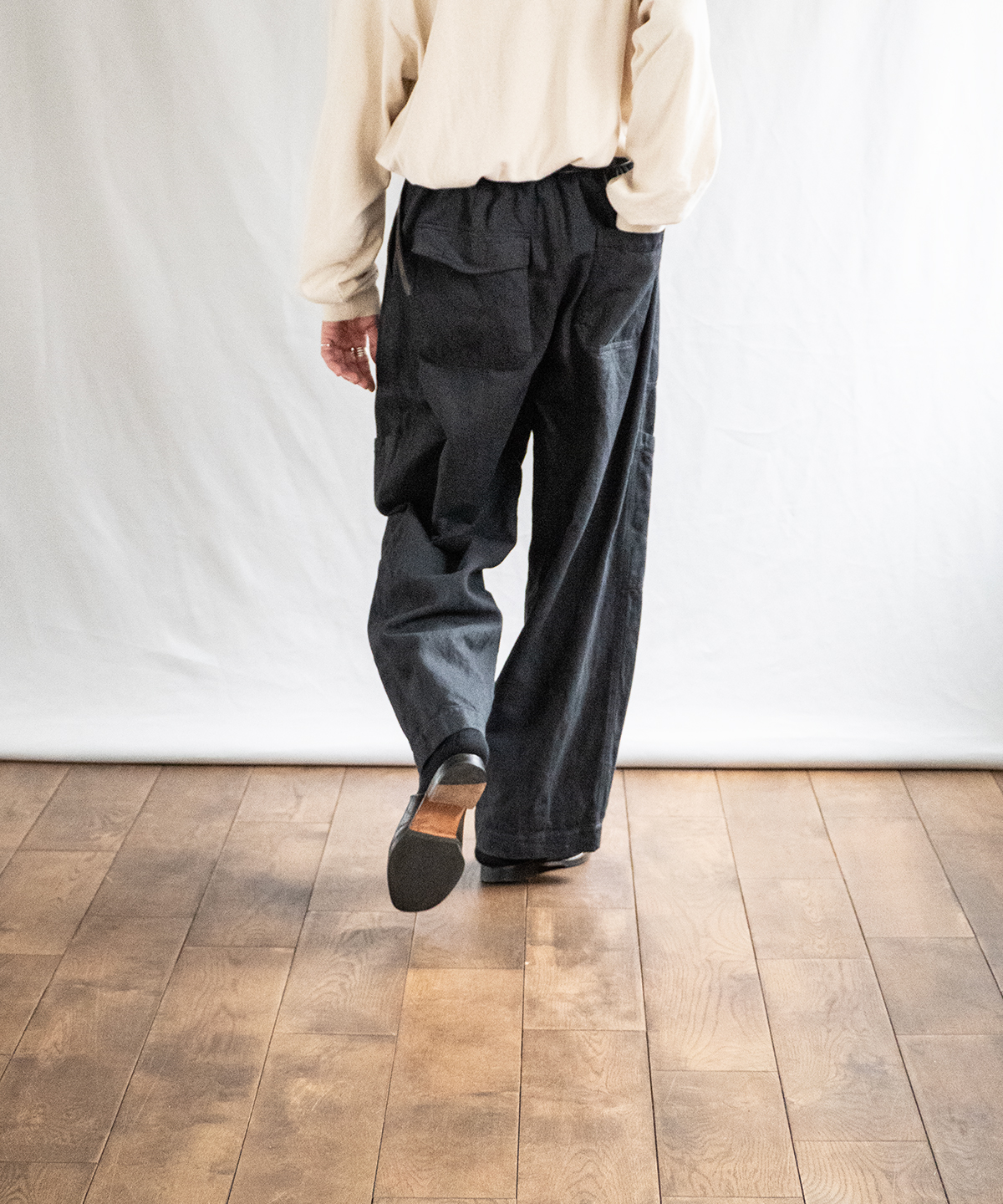 일본의 전통 수제 종이인 ‘와시(和紙, Washi)’로 만든 실과 면실로 교직하여 짠 카츠라기(두껍게 짠 트윌 소재의 일종) 원단으로 만든 유틸리티 팬츠입니다.