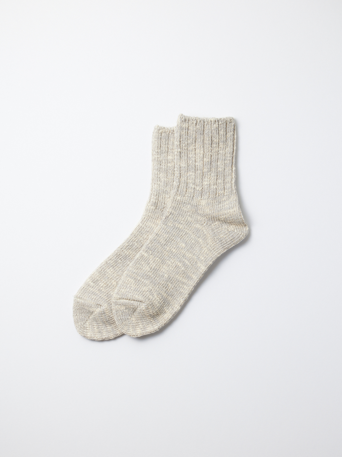 두꺼운 유기농 면을 사용한 슬라브사(Slab Organic Cotton Yarn)와 리싸이클 면사(Recycle Cotton Yarn)를 믹스하여 희귀한 구식 편직기로 정성스럽게 짠 로우 게이지 양말입니다.