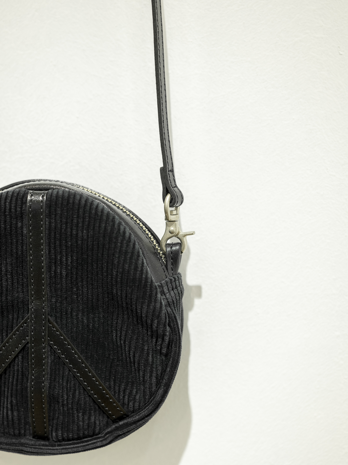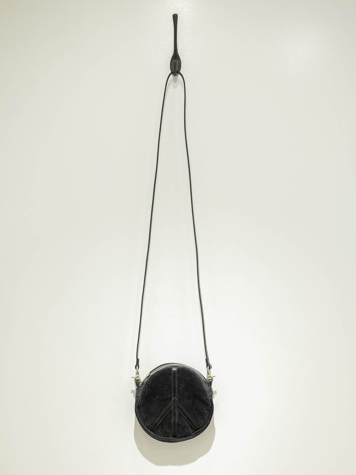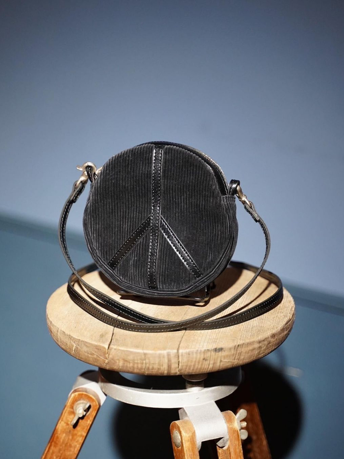 가방과 유사한 색상으로 염색한 가죽을 사용하여 표현한 평화 기호(☮) 모양의 디테일은 고급스러우면서도 디자인에 포인트가 됩니다. 스트랩도 동일한 가죽 소재로 제작되었습니다.