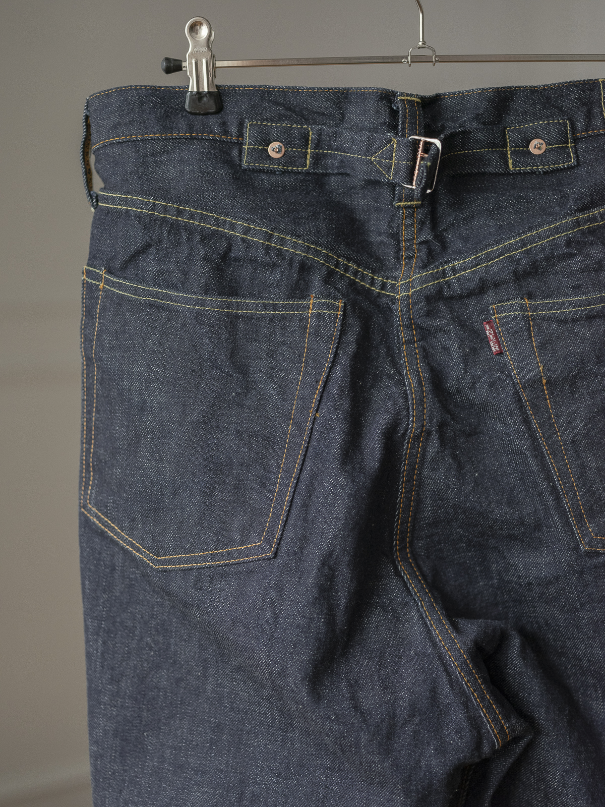 "SOLIDE" 각인이 새겨진 철제 신치백, 특수 도금 처리한 프런트의 철제 오리지널 로고 버튼, 옐로우와 오렌지 스티치, 백 포켓의 히든 리벳과 가랑이 부분의 리벳 등 오리지널 모델의 디테일들을 충실하게 고증하였습니다. 오른쪽 백 포켓에는 레이온 소재의 레드탭이 달려 있습니다.
