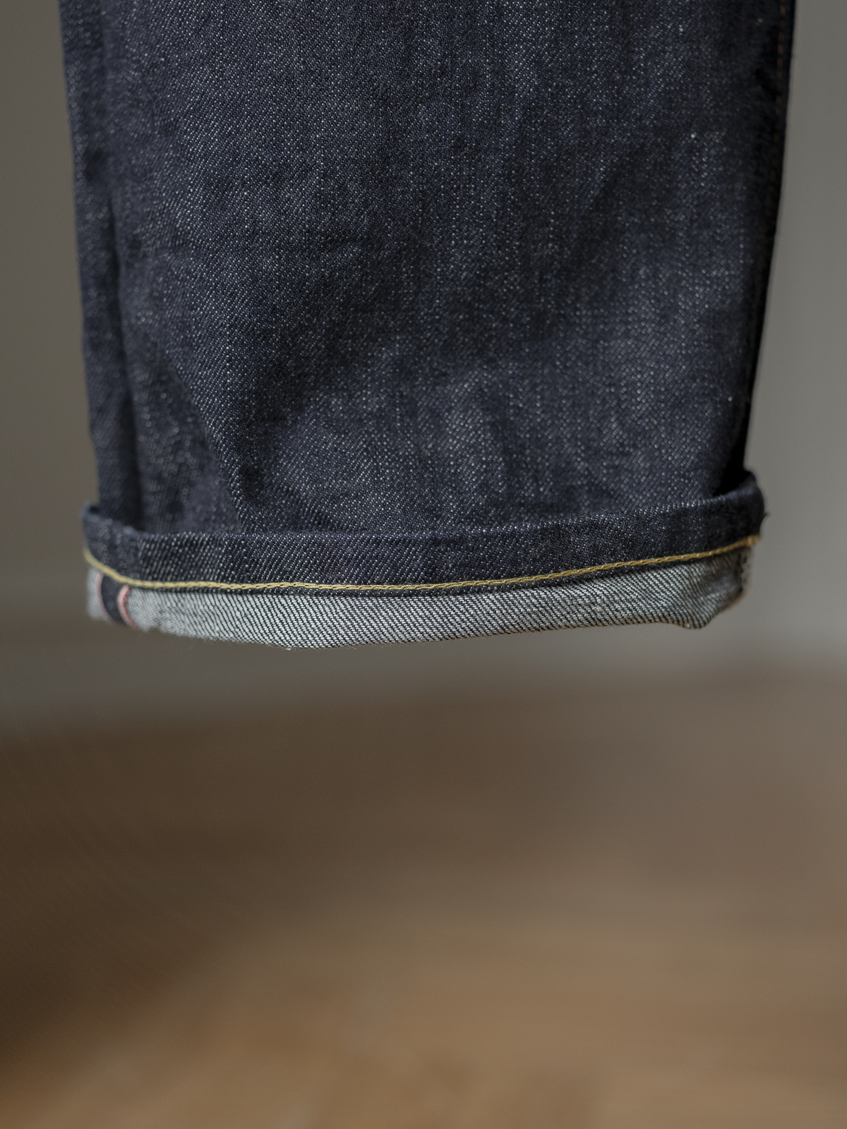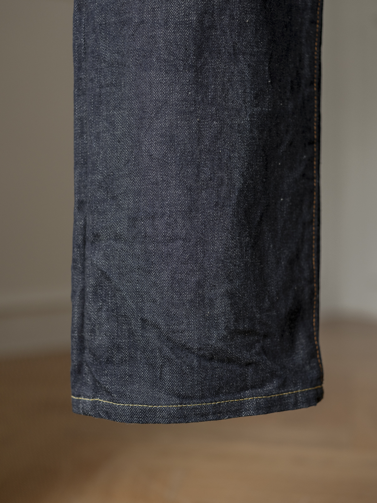 원단은 일본의 유서 깊은 데님 공장에서 짠 14oz 헤비 온스 셀비지 데님을 사용하였습니다. 구형 셔틀 직기로 위사(가로실)를 최대의 밀도로 하여 짜냄으로써, 바삭하고 단단한 원단감을 구현해 냈습니다.