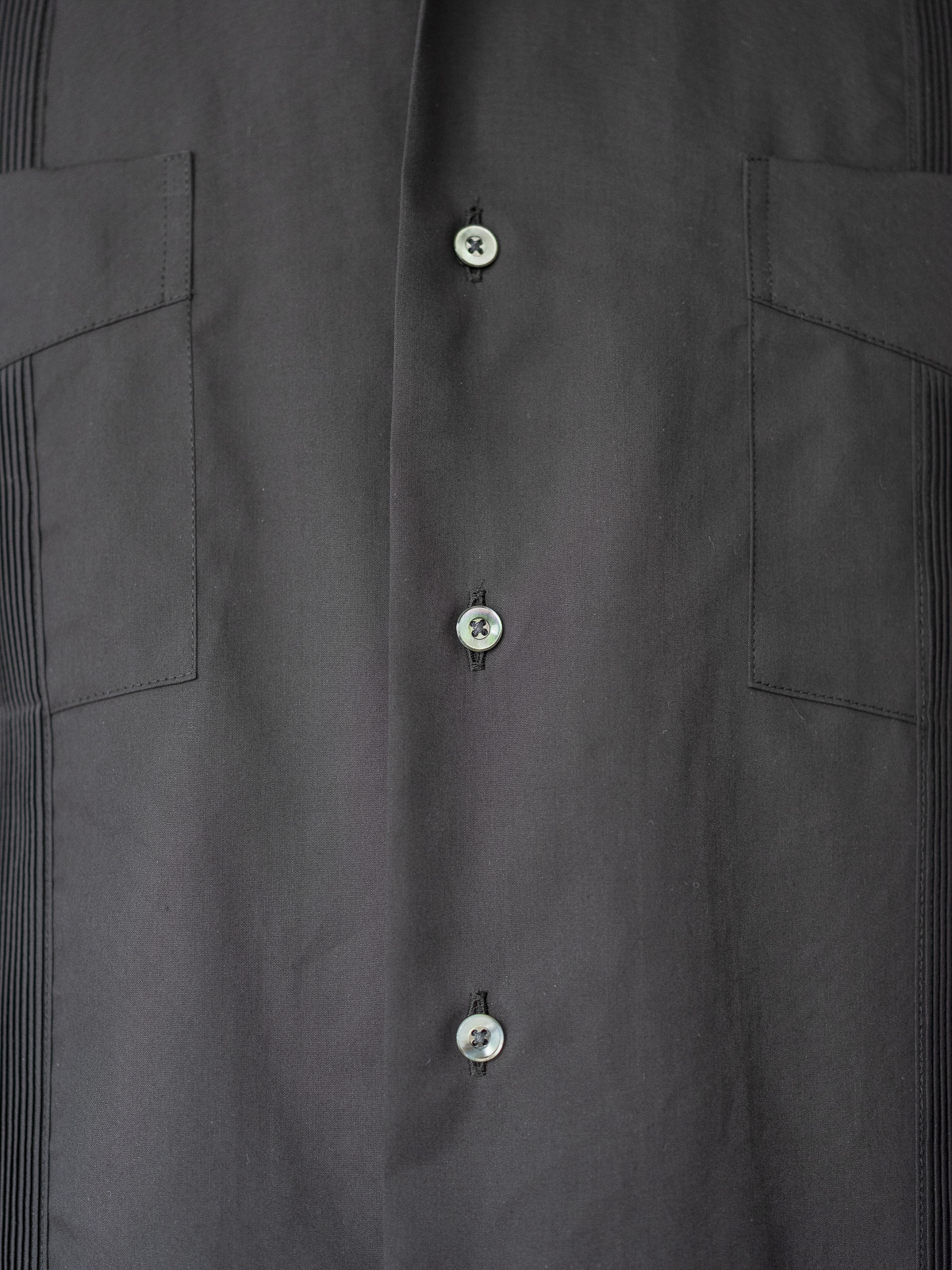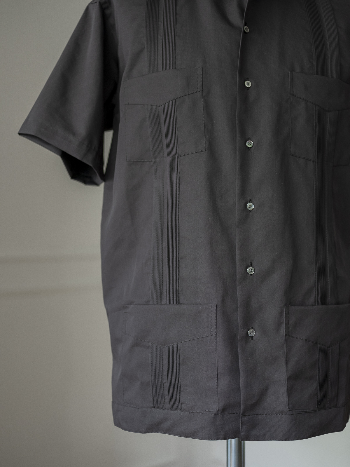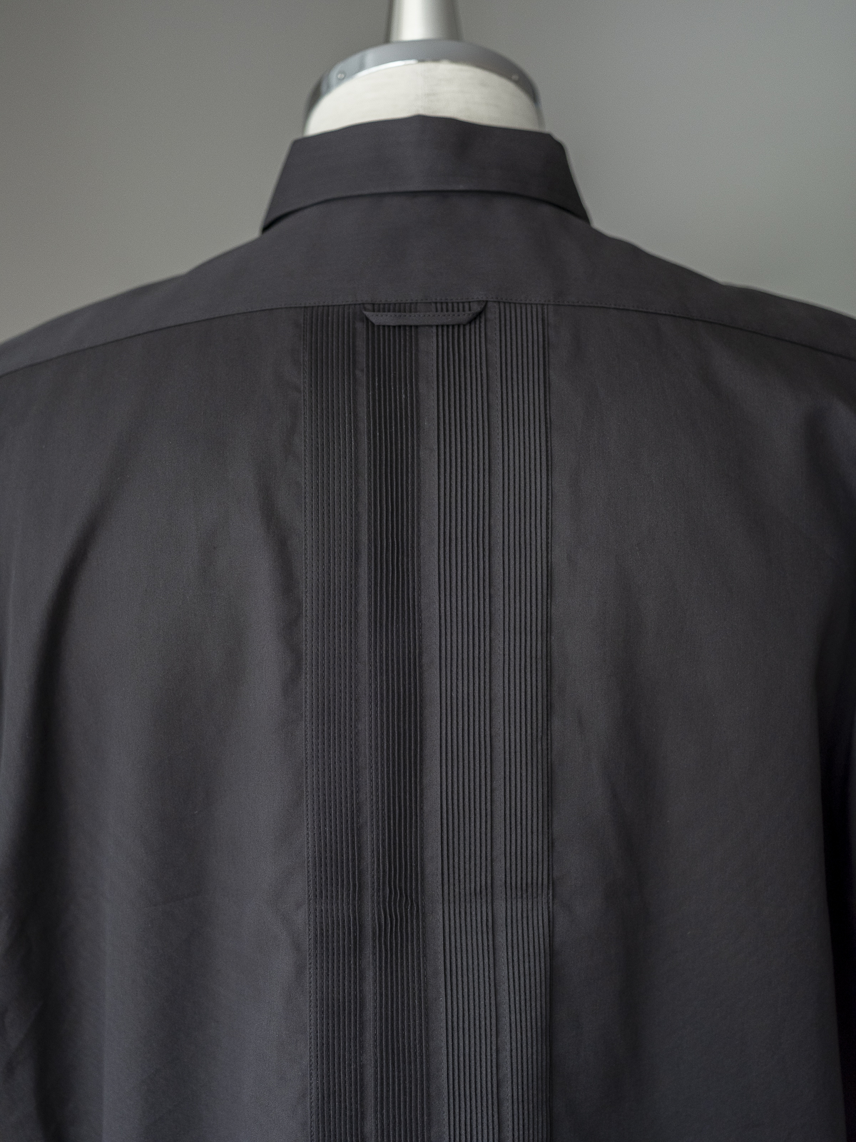 낙낙한 박스 실루엣과 4개의 포켓, 그리고 머신으로는 구현할 수 없는 손으로 일일이 정교하게 잡은 아름다운 핀턱이 양 사이드와 등 부분에 위치합니다.