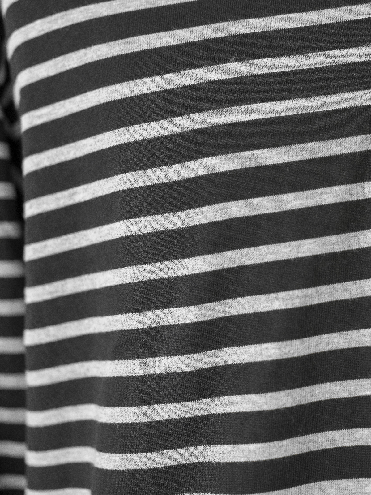 가로로 들어간 블랙 앤 그레이 스트라이프와, 칼라와 소맷단 부분의 배색 포인트가 인상적인 제품입니다.
