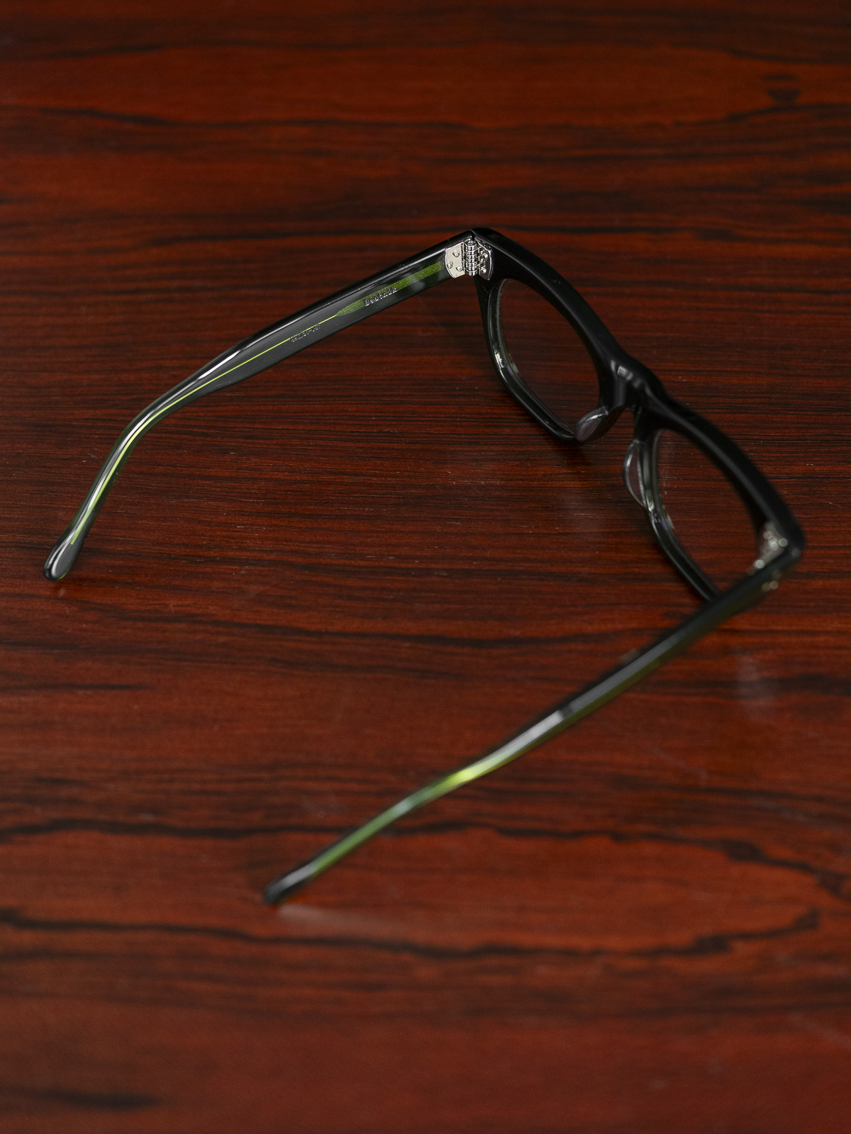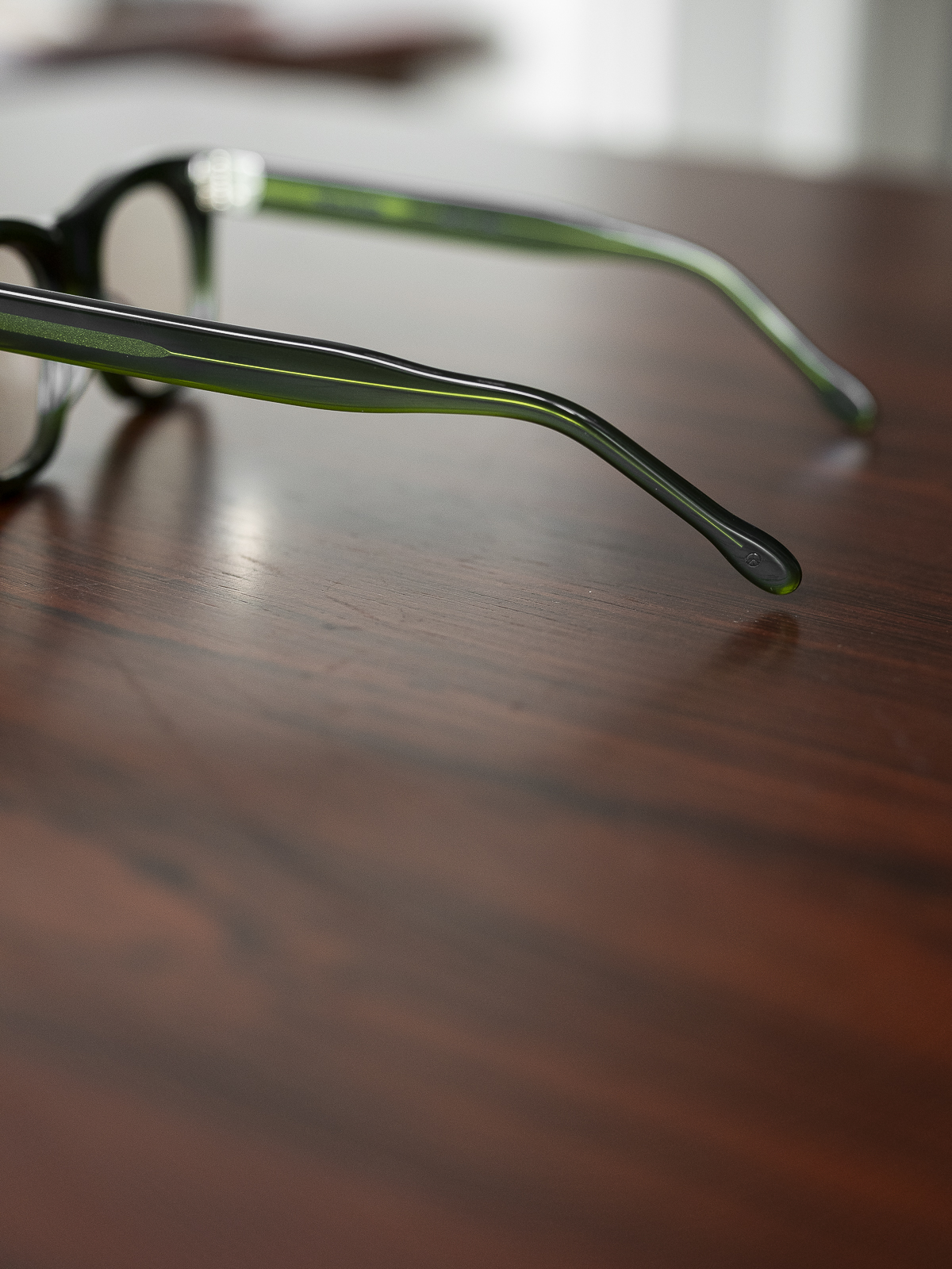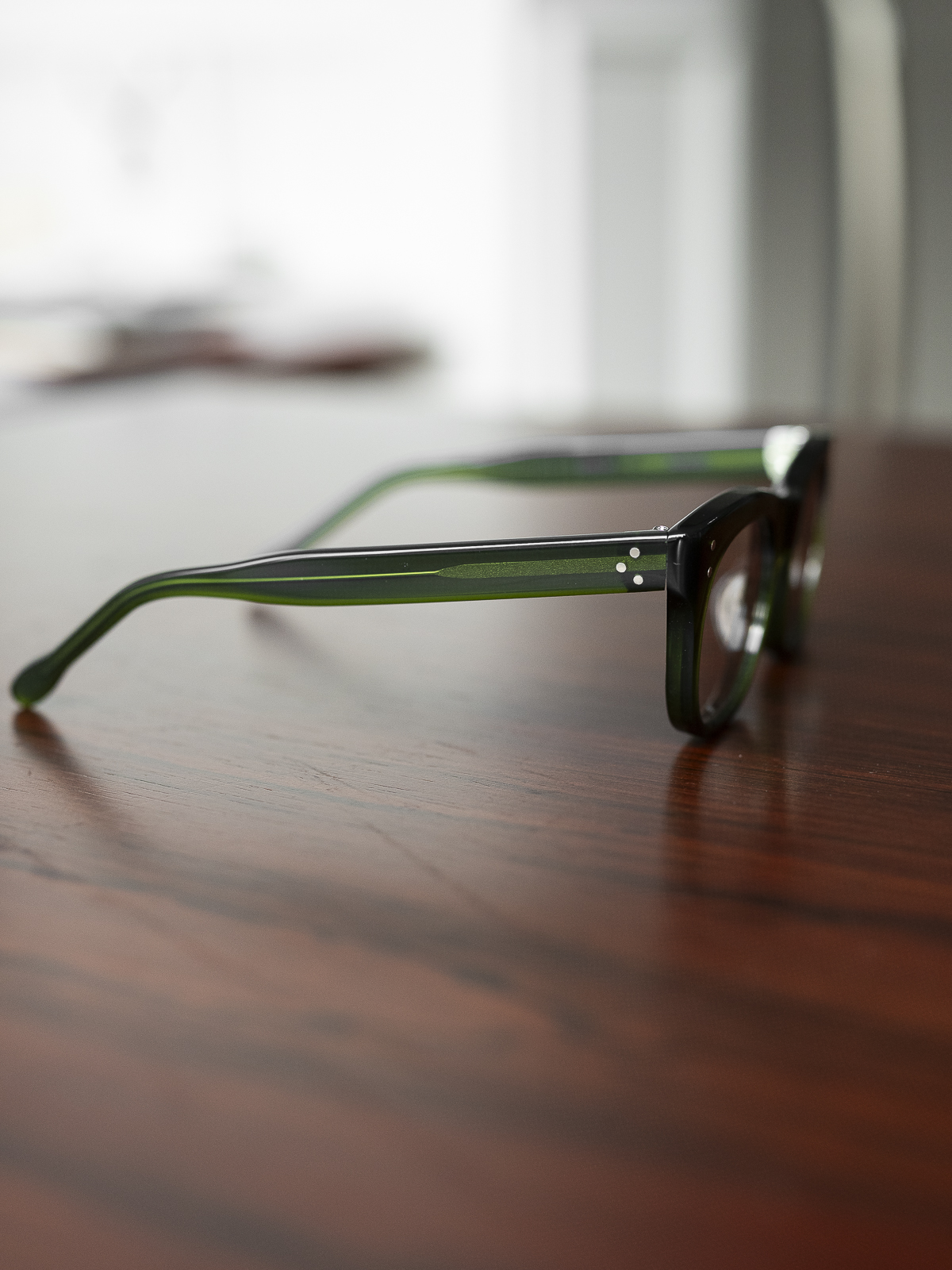 힌지 부분은 견고한 7첩 경첩 구조로 결합되어 있으며, 리벳을 장인의 수작업으로 두드려서 체결하는 오랜 전통의 카시메(かしめ) 공법을 통하여 완성하였습니다. 엔드 피스 부분의 투 닷(Two Dot), 템플 부분의 쓰리 닷( Three Dot) 리벳 디테일이 아름다운 제품입니다.