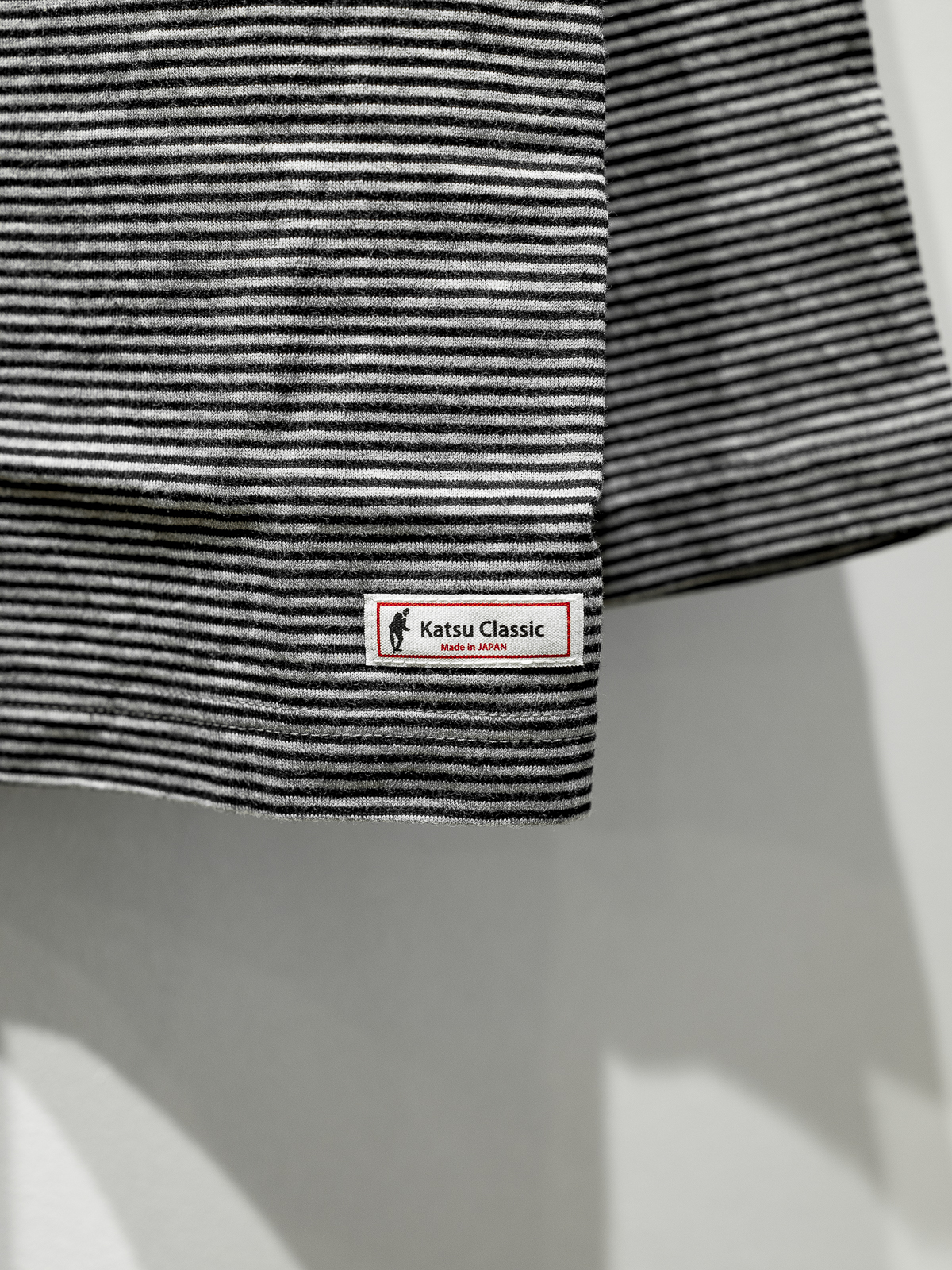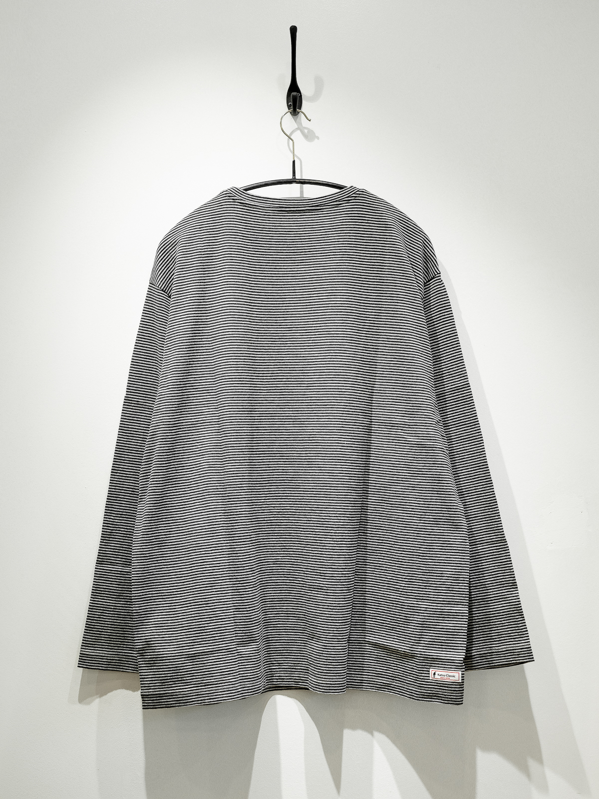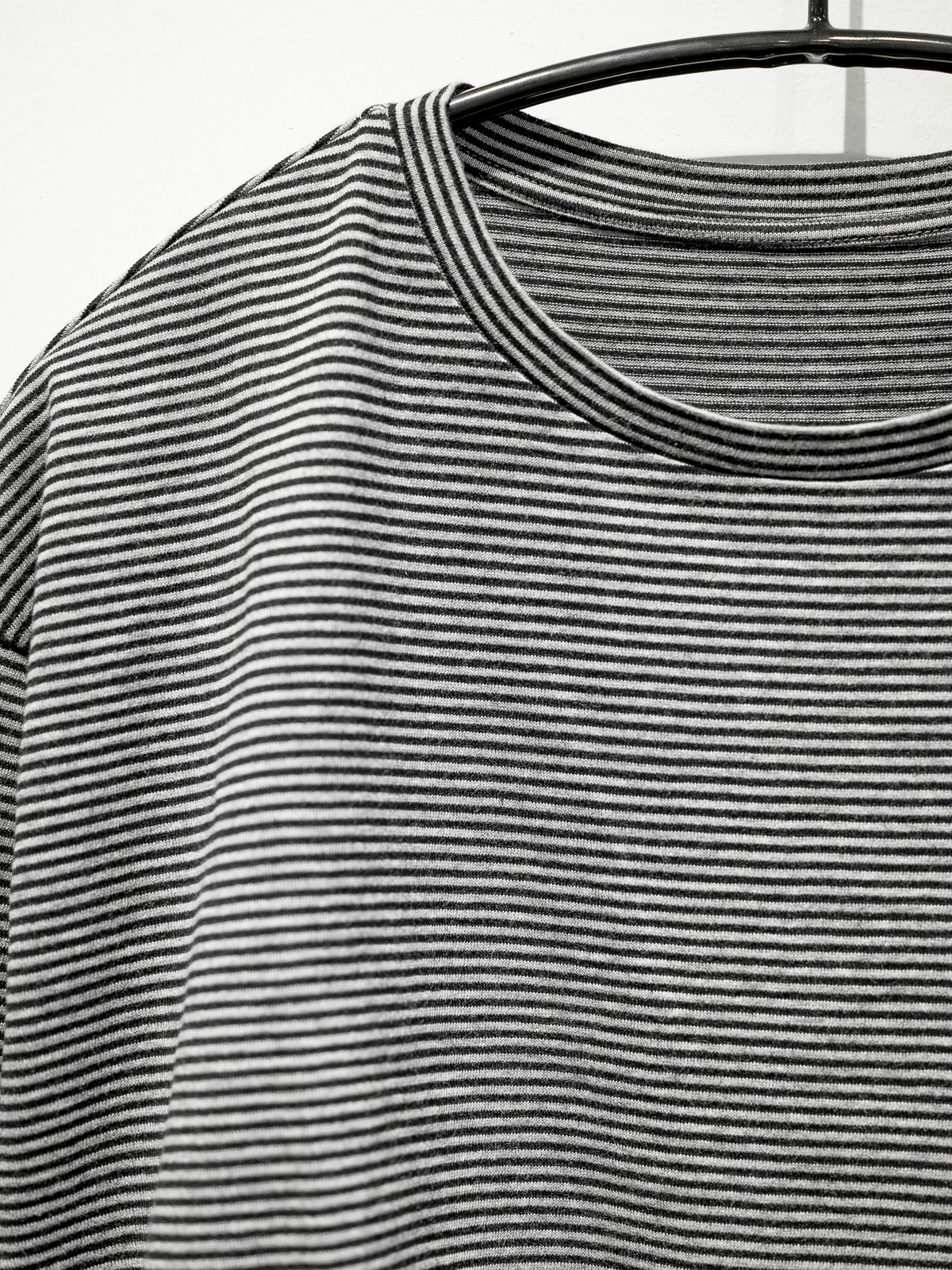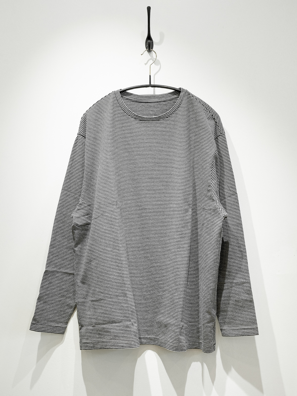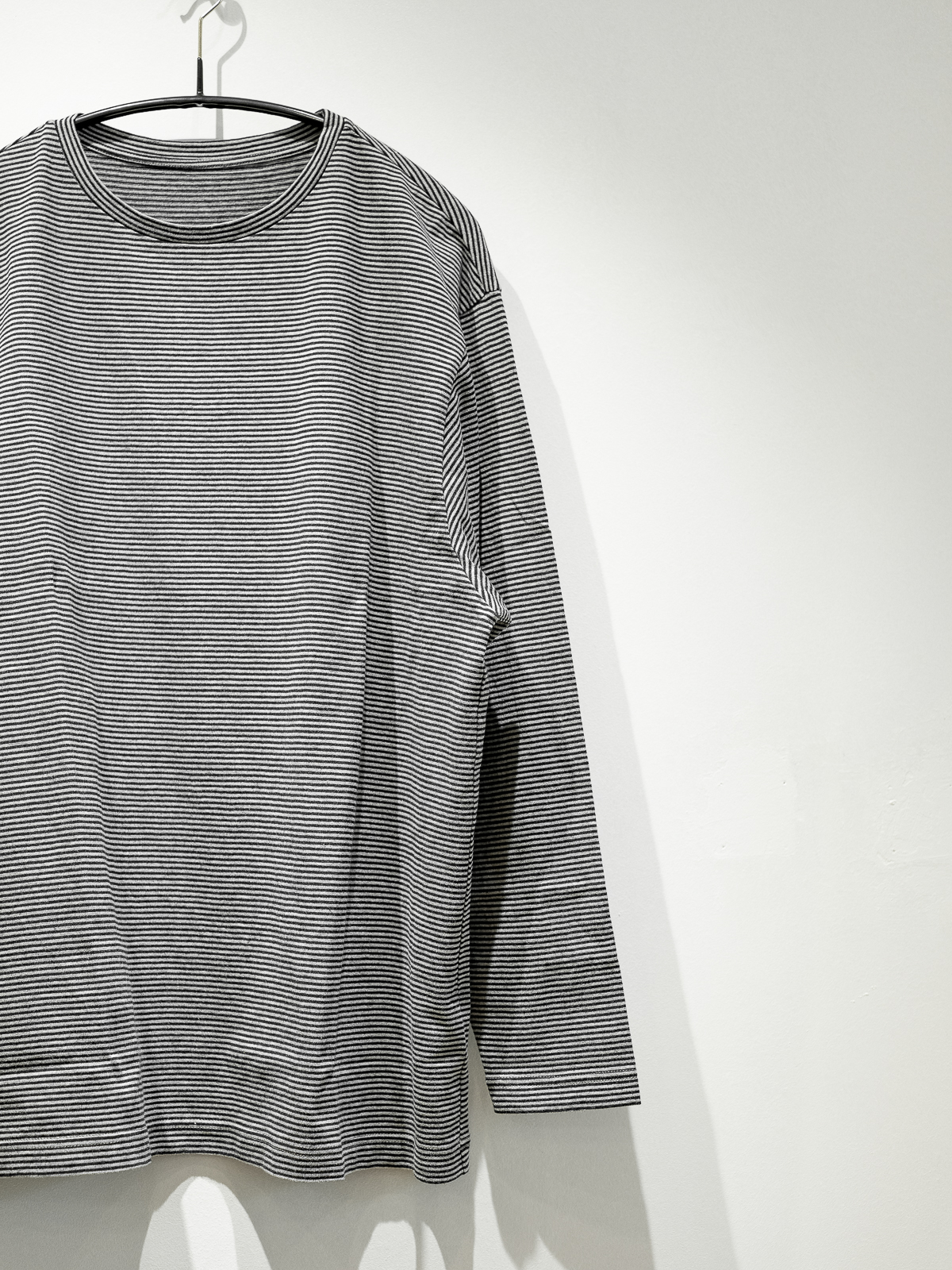 동일한 폭의 가느다란 스트라이프가 블랙과 그레이 색상으로 교차하여 들어가 있기 때문에, 폭이 넓고 강렬한 인상의 일반적인 스트라이프 티셔츠에 비해 부담스럽지 않은 편안한 발색을 보여줍니다.