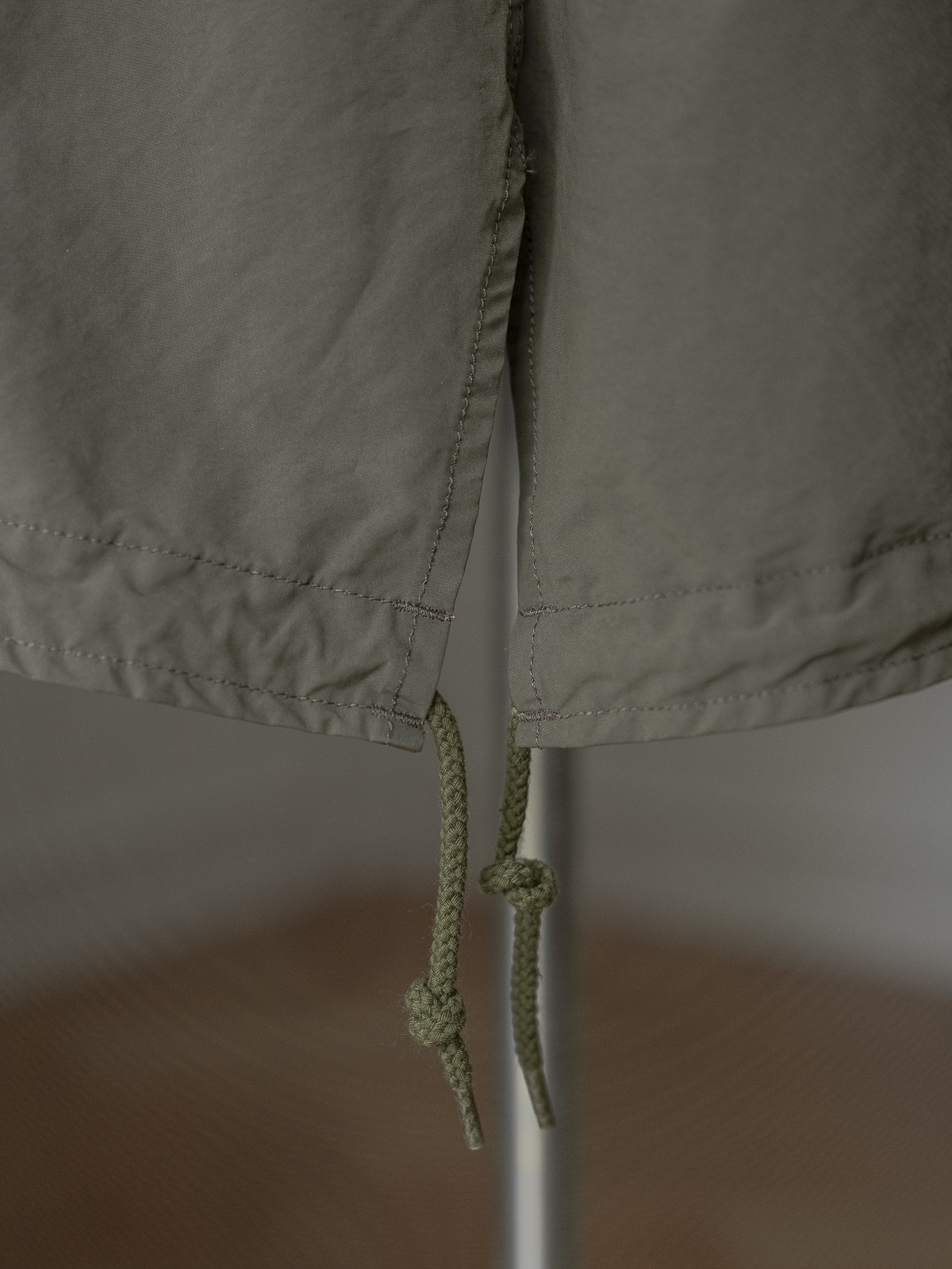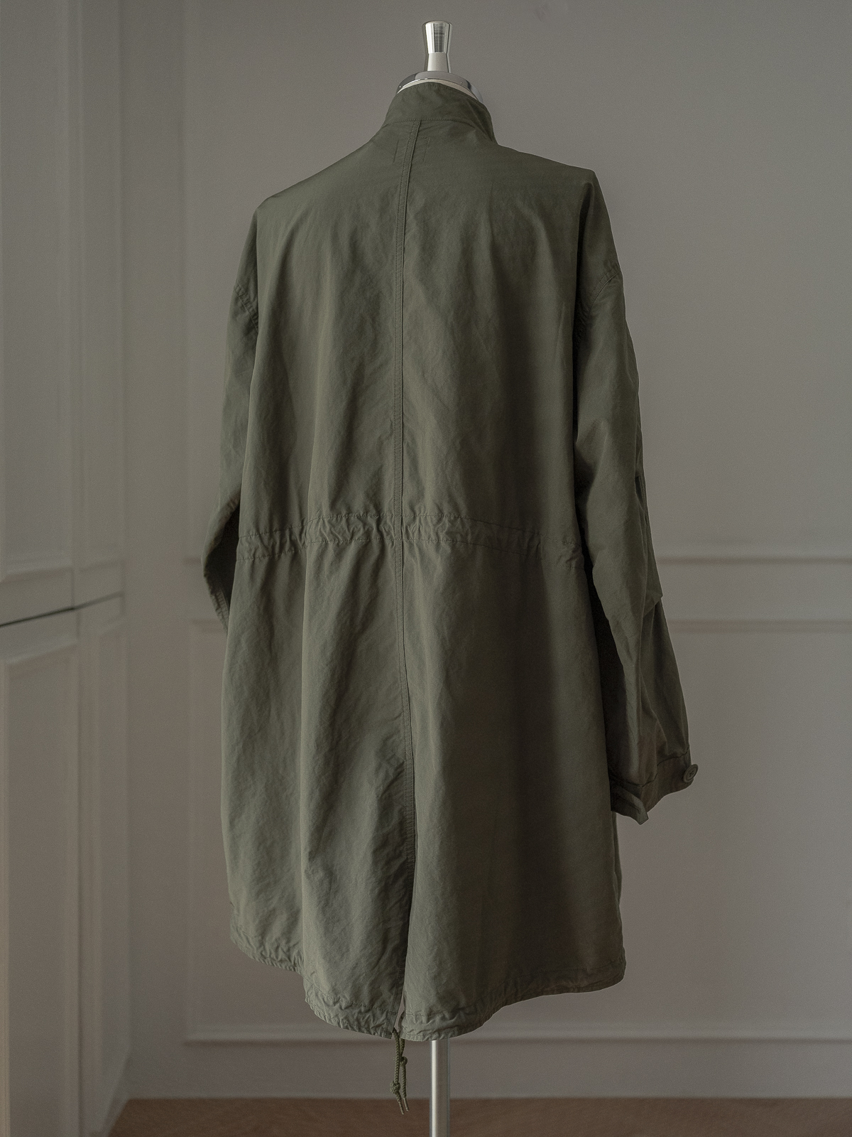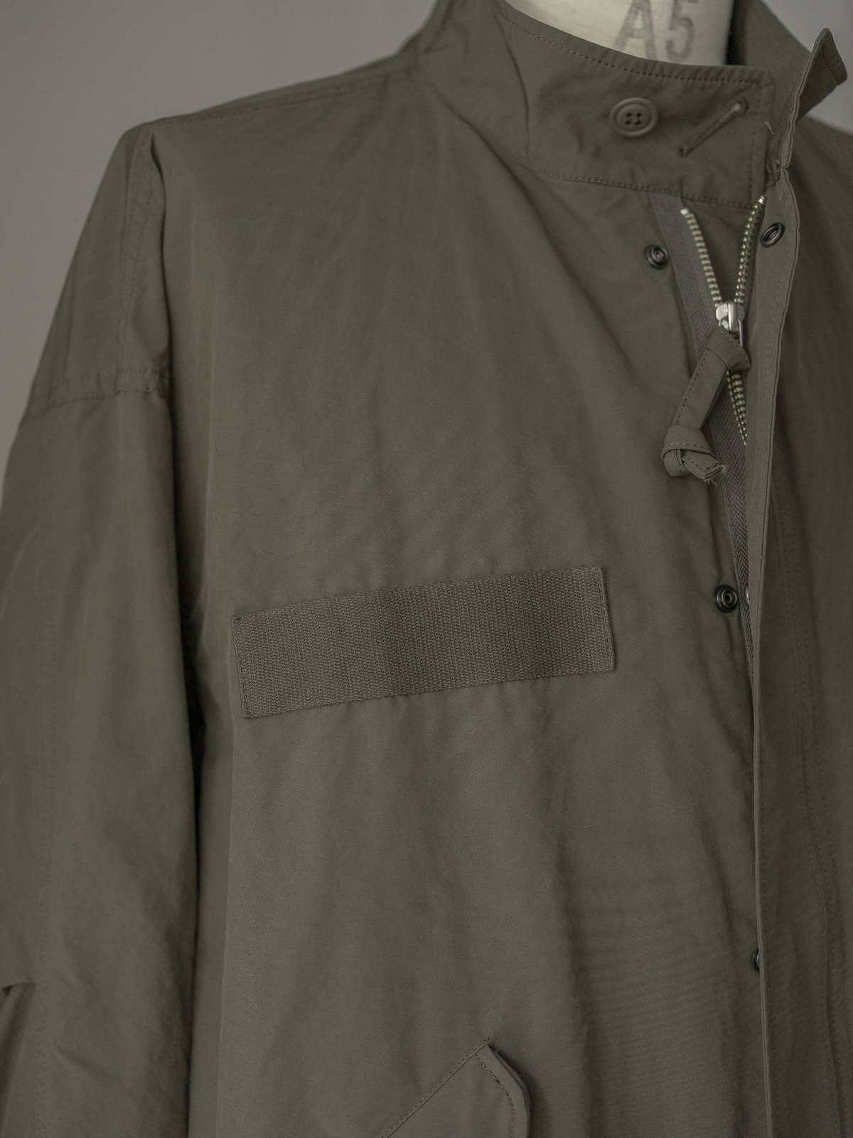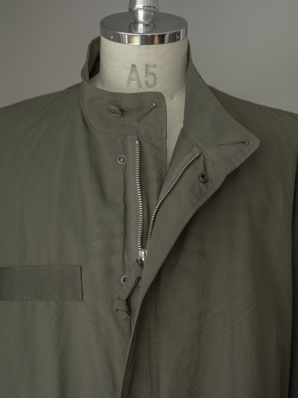 높지 않은 밴드 칼라 사양에 프런트에는 지퍼와 스냅 버튼이 함께 달려 있습니다. 드롭 숄더와 여유로운 실루엣으로 매우 다양한 스타일링에 활용이 가능한 범용성 높은 아우터입니다.