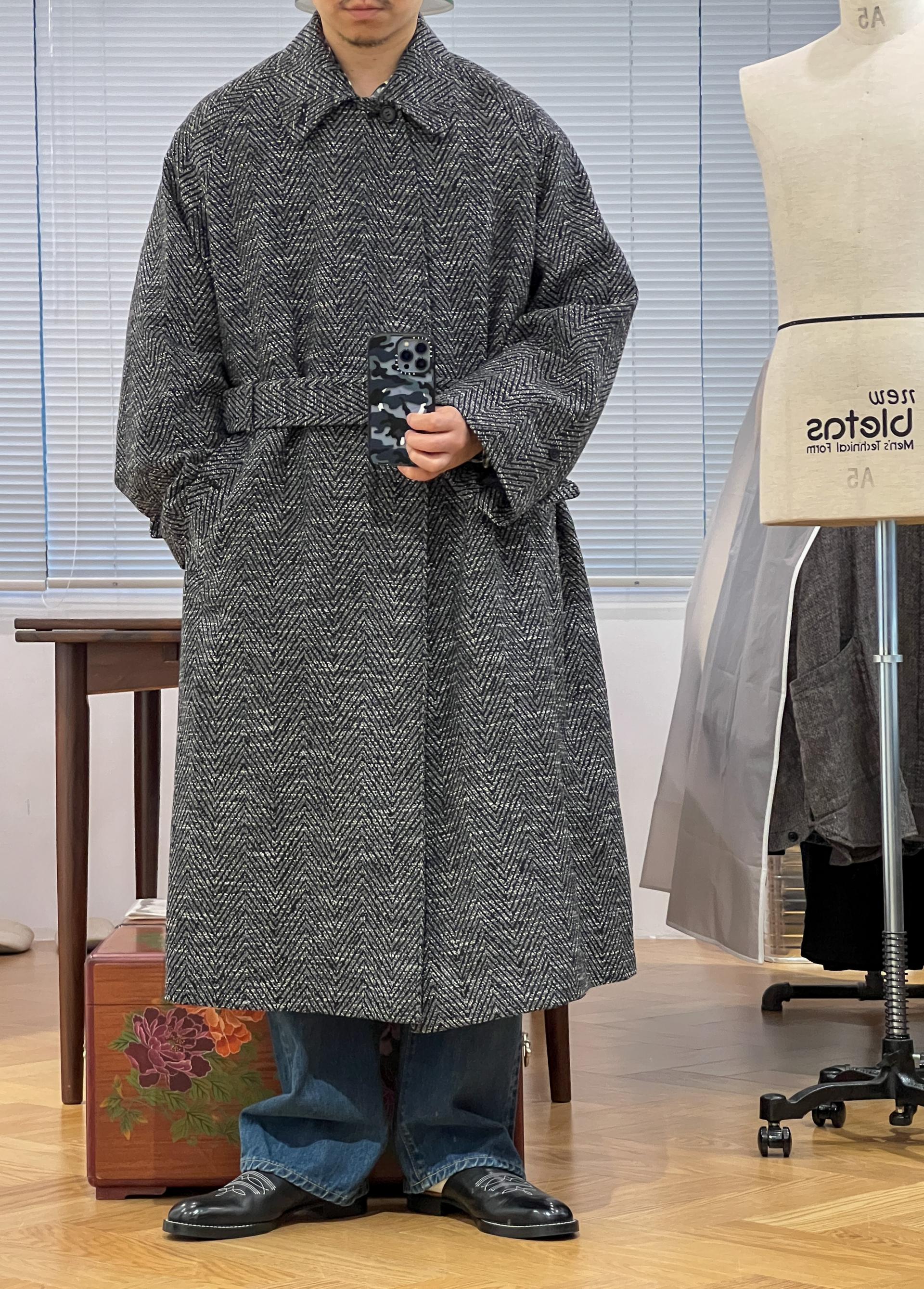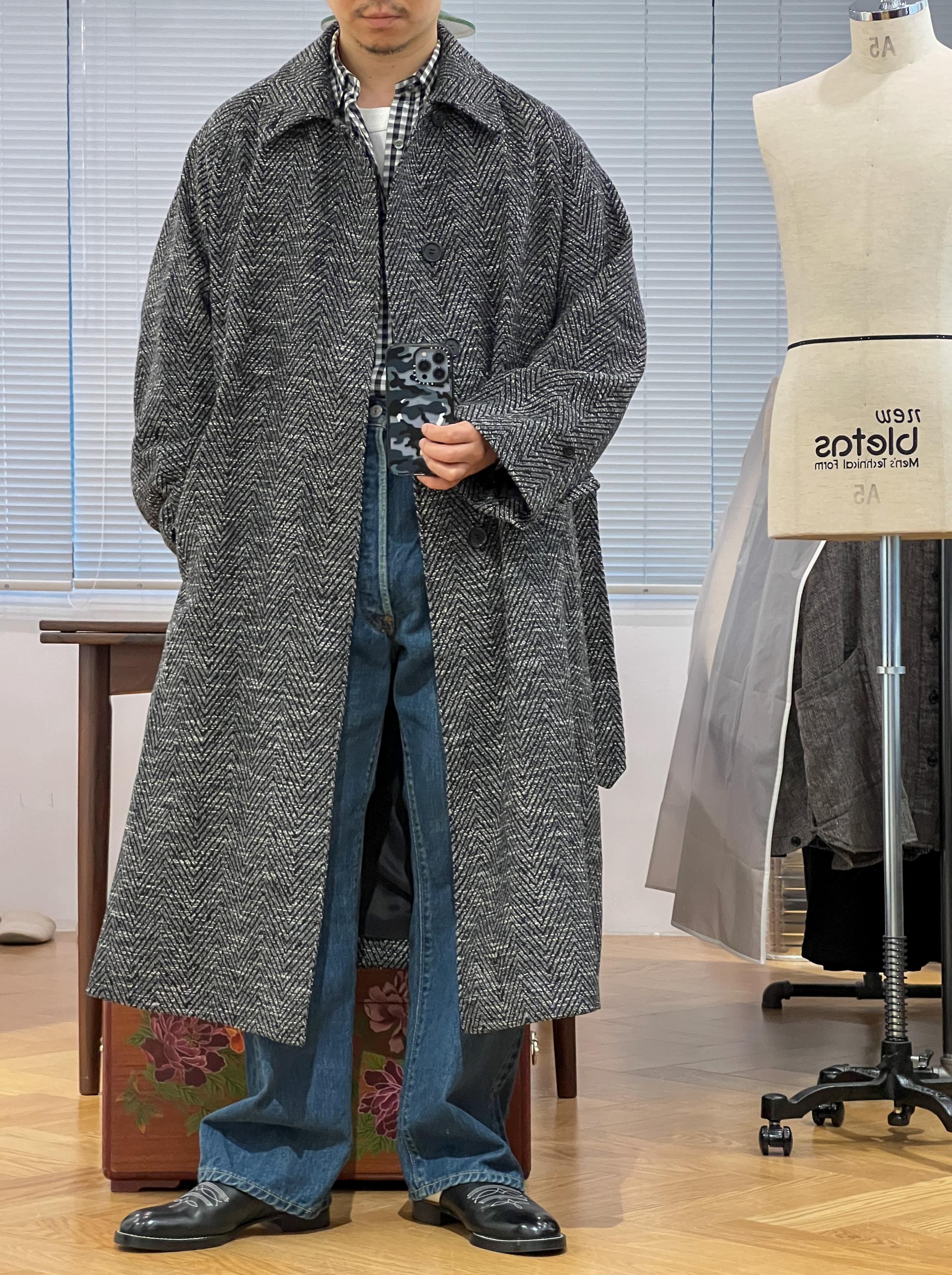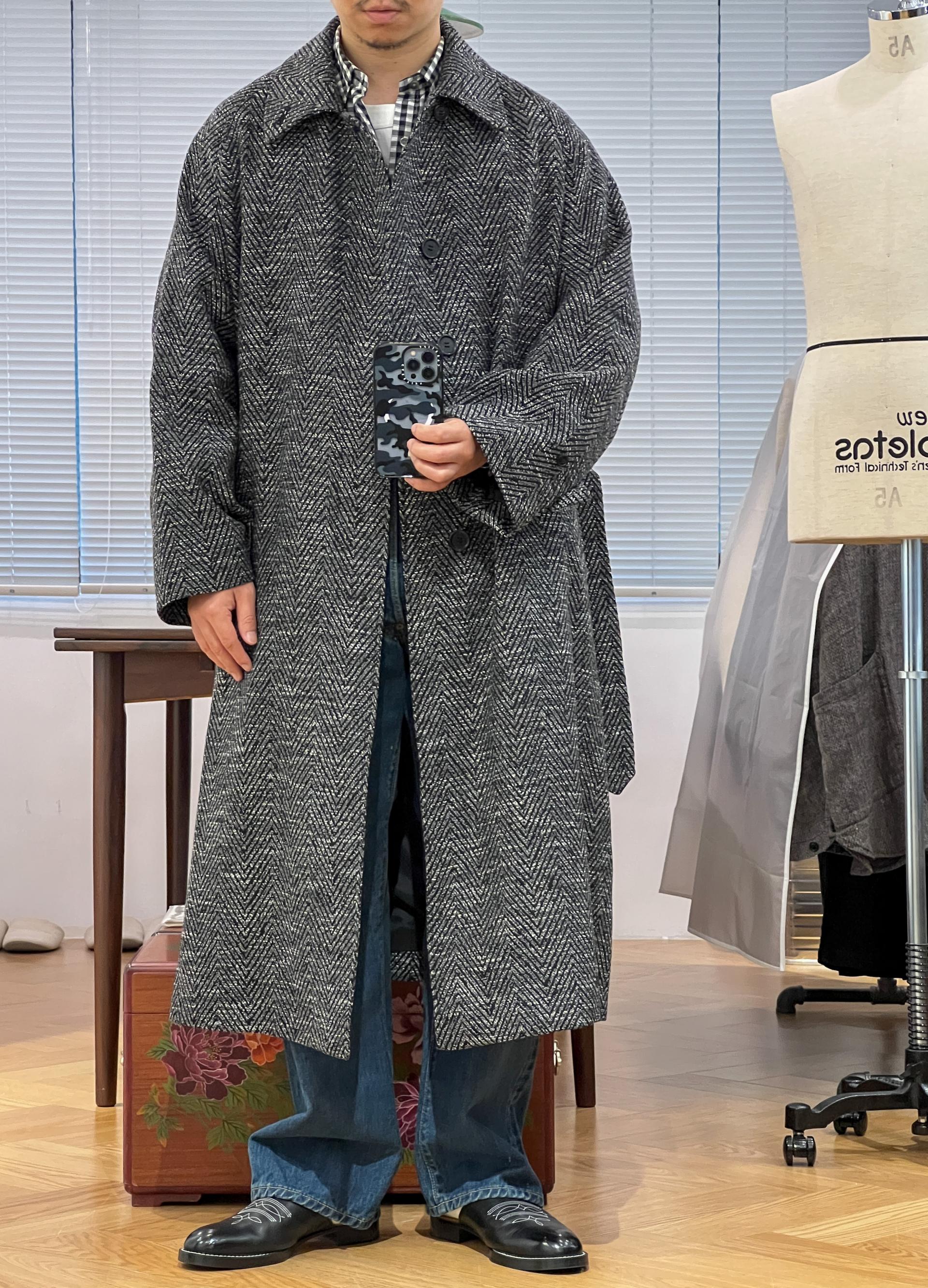 프랑스 LVMH(루이비통모에헤네시)사의 희귀한 데드 스탁 컬렉션에서 엄선한 이탈리아제 도네갈 헤링본 원단으로 만든 싱글 래글런 코트입니다.