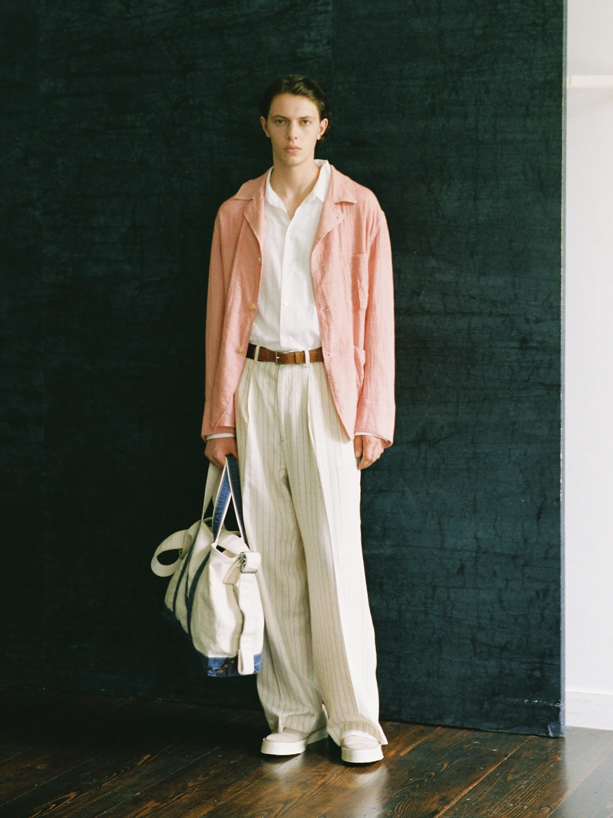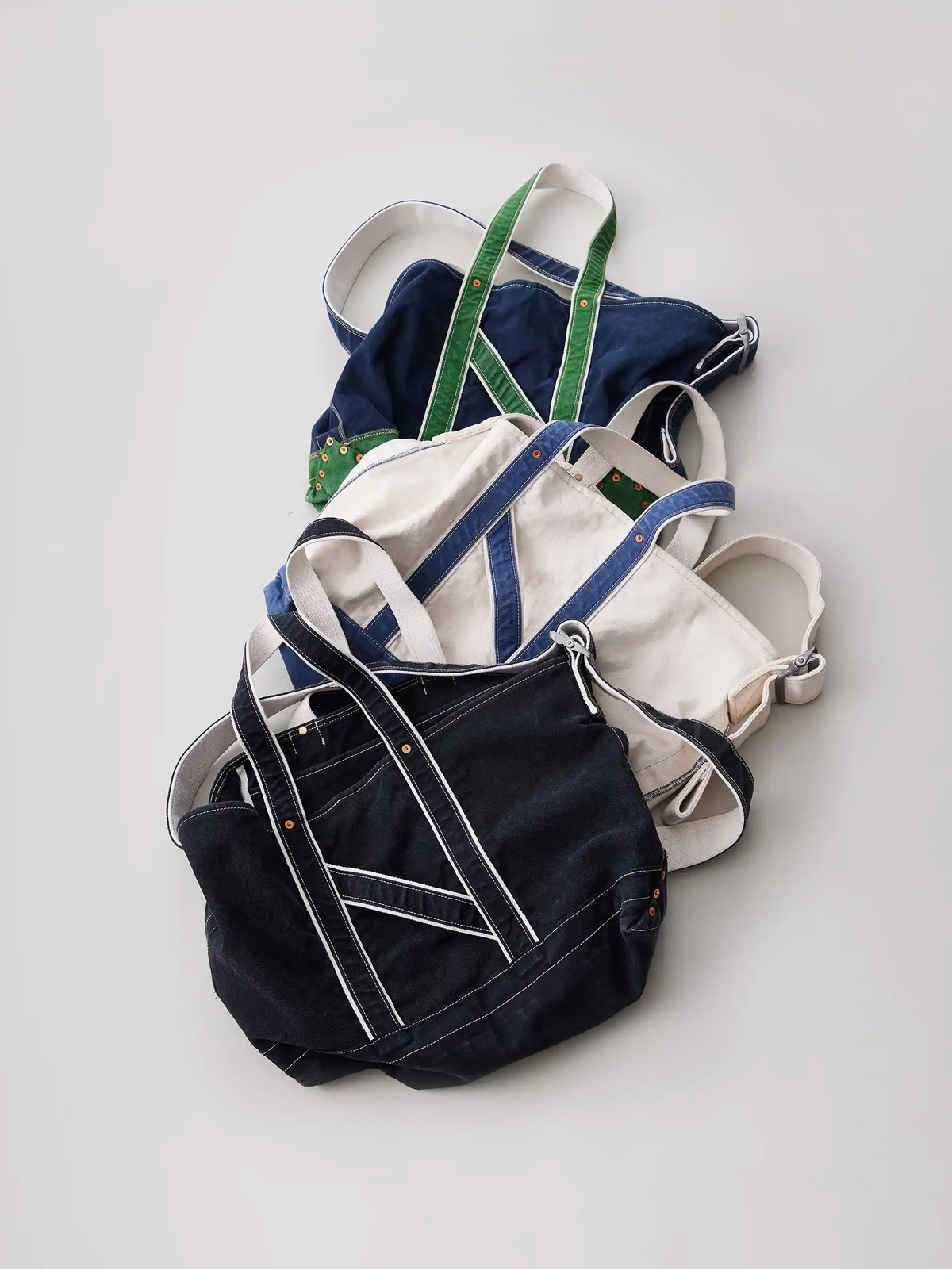 구형 셔틀 직기로 짠 범포(캔버스) 원단에 와셔 가공을 실시하여 자연스러운 주름을 의도하였으며, 제품 상태에서 진행한 스톤 워싱 가공을 통해 더욱 빈티지한 색감과 촉감을 구현하였습니다.