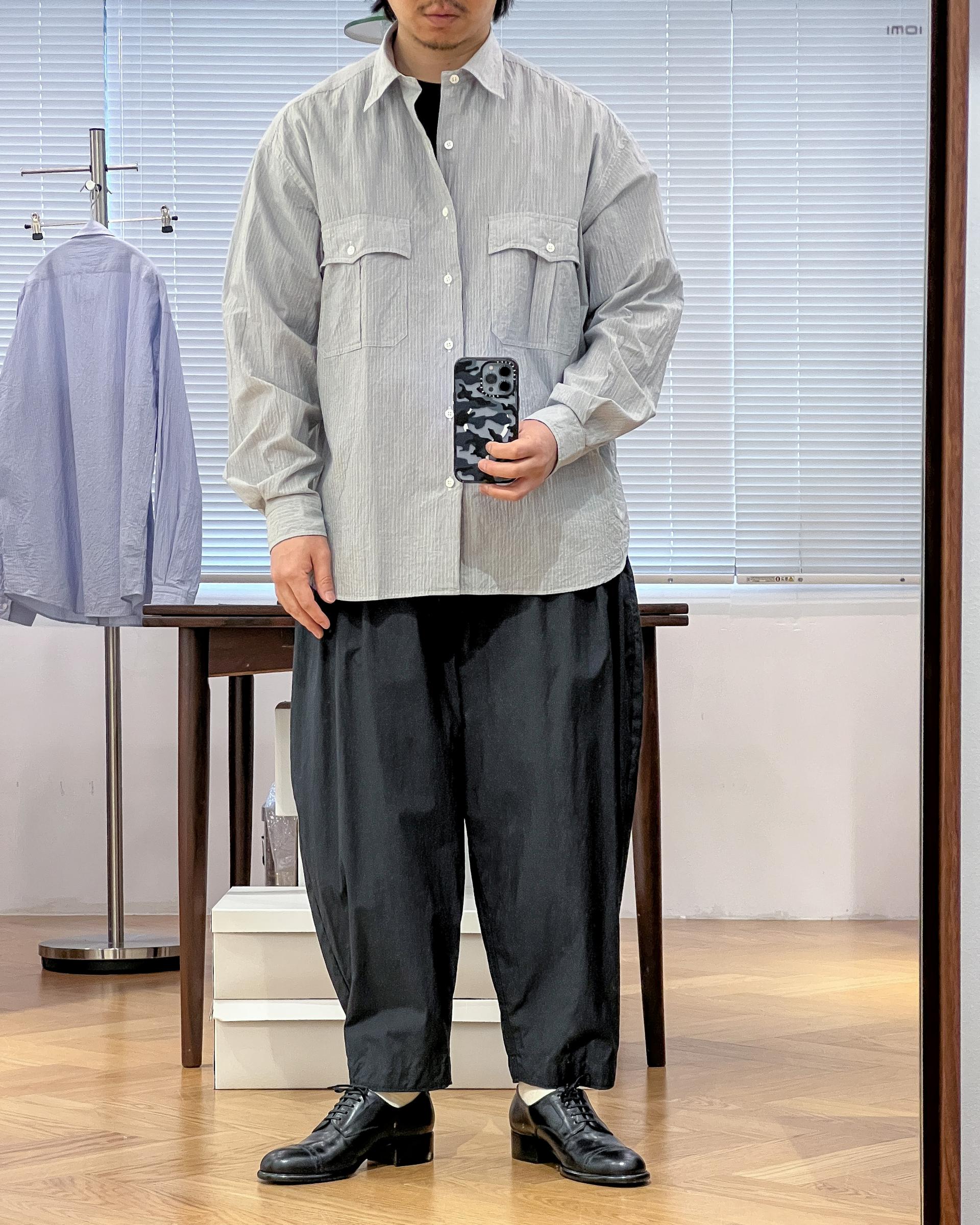 롤업 깅엄 체크 셔츠와는 달리 등판 부분의 게더(Gather) 디테일이 생략되어 스트라이프 패턴과 원단 자체가 주는 질감의 매력을 은은하게 즐기실 수 있습니다.