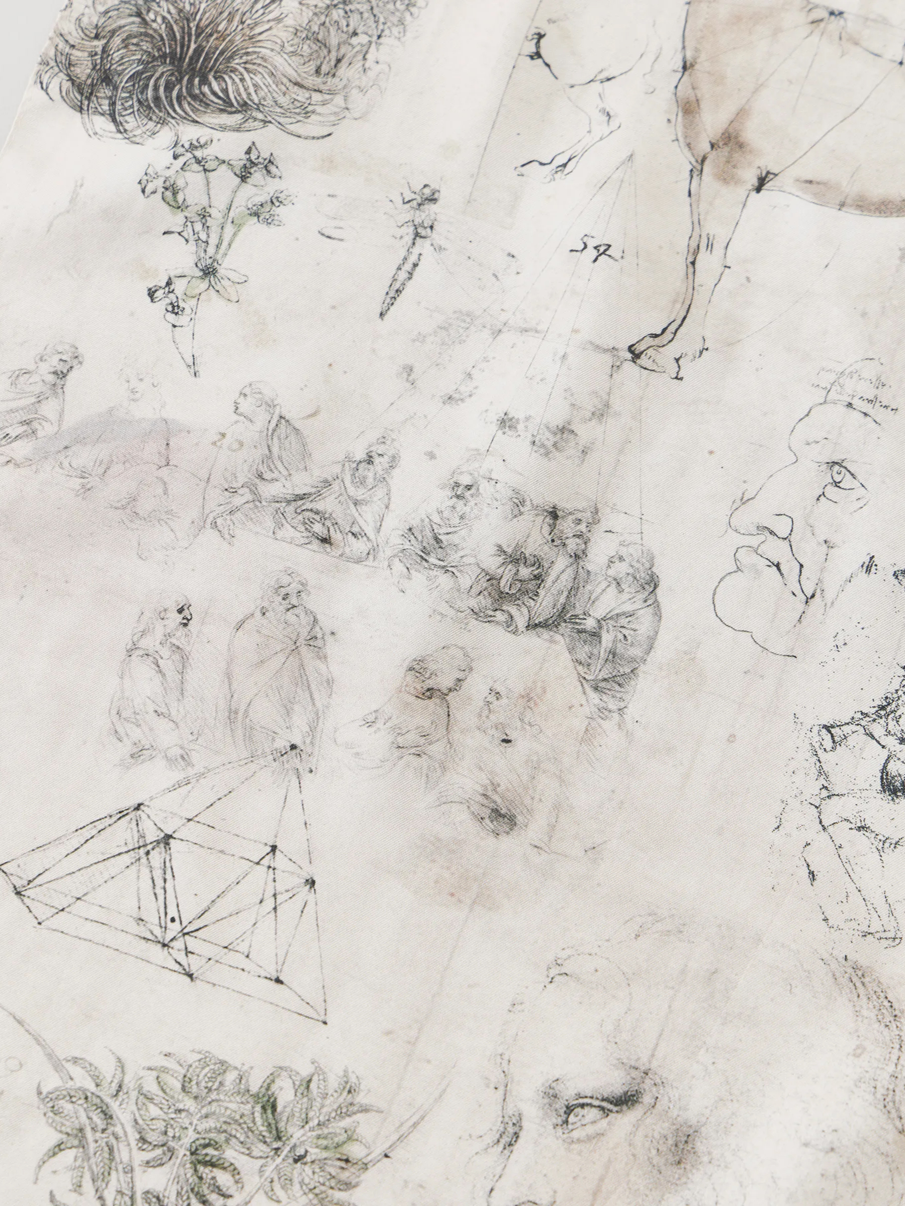 레오나르도 다빈치의 작품에서 영감을 받은 그래픽을 고품질의 실크에 프린트한 스카프입니다.