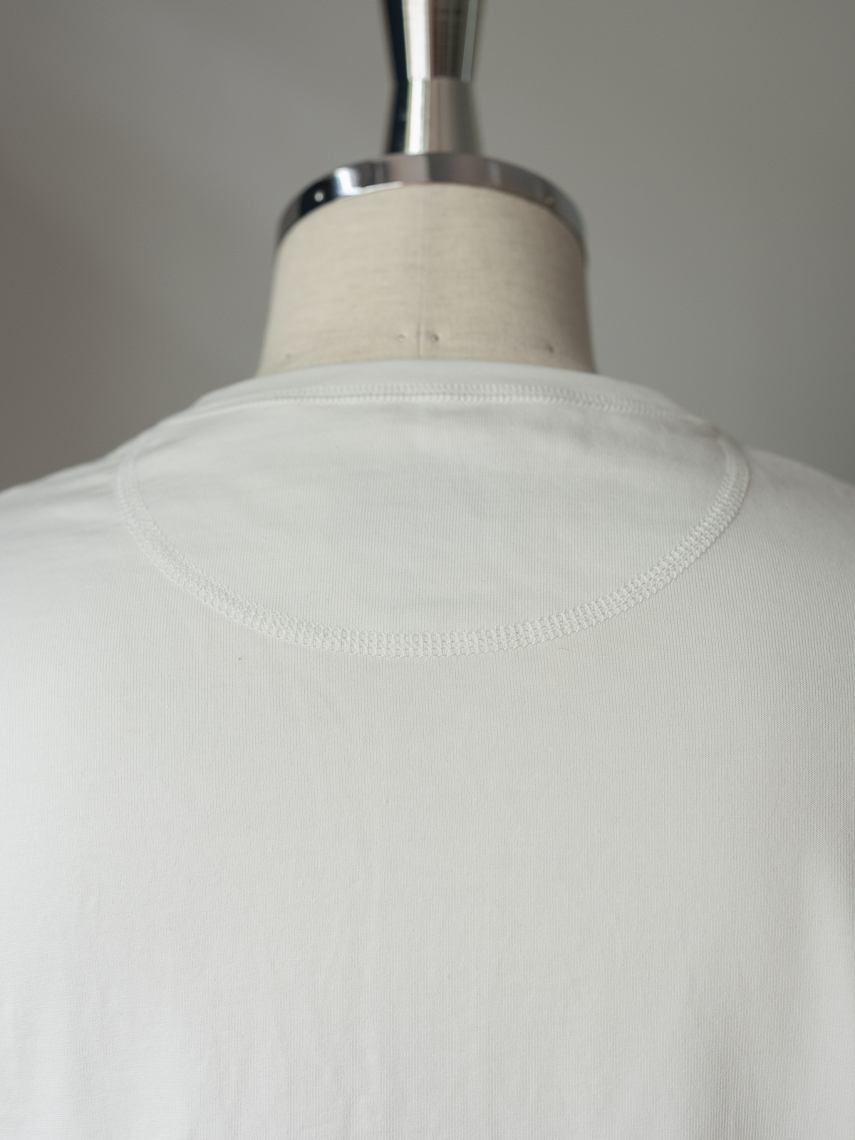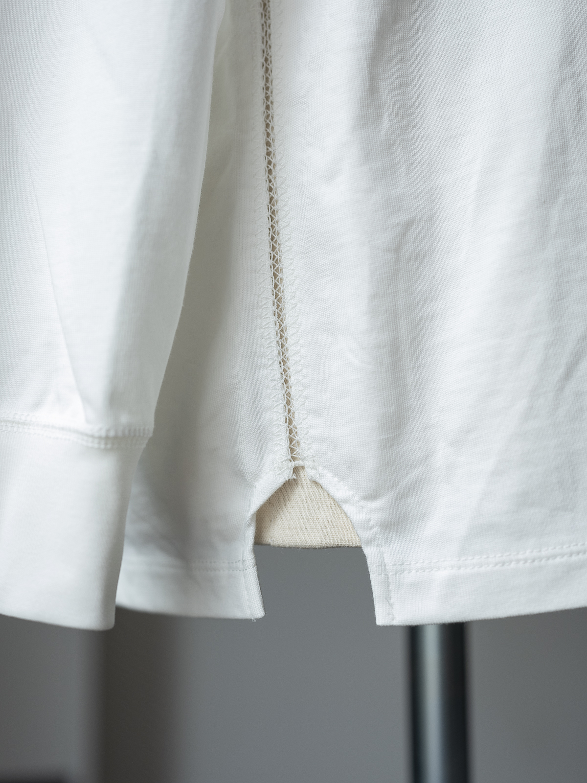옆구리 선을 Ladder Seam이라는 극도로 섬세하고 아름다운 스티치로 마감하여, 미적인 부분 뿐만 아니라 통기성에도 도움을 주는 디테일입니다.
